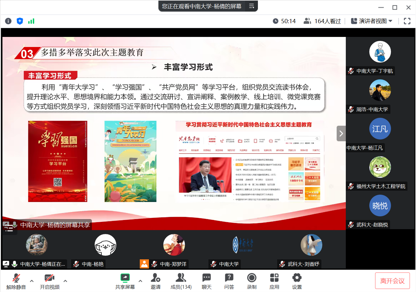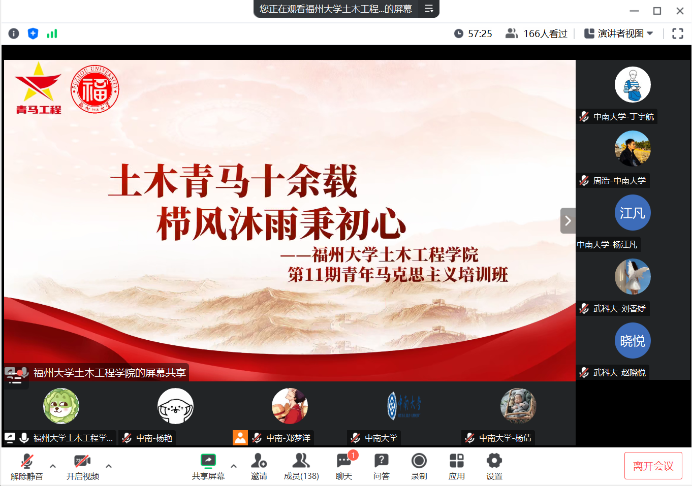 青马班党支部成员、青马班班长祁湘平从思想引领、人才培养、优秀成果三方面,结合学院在党建实际工作中对 “党建+”新工作模式的具体探索,介绍了培育创建全国党建工作样板党支部的新思路、新途径、新方法。