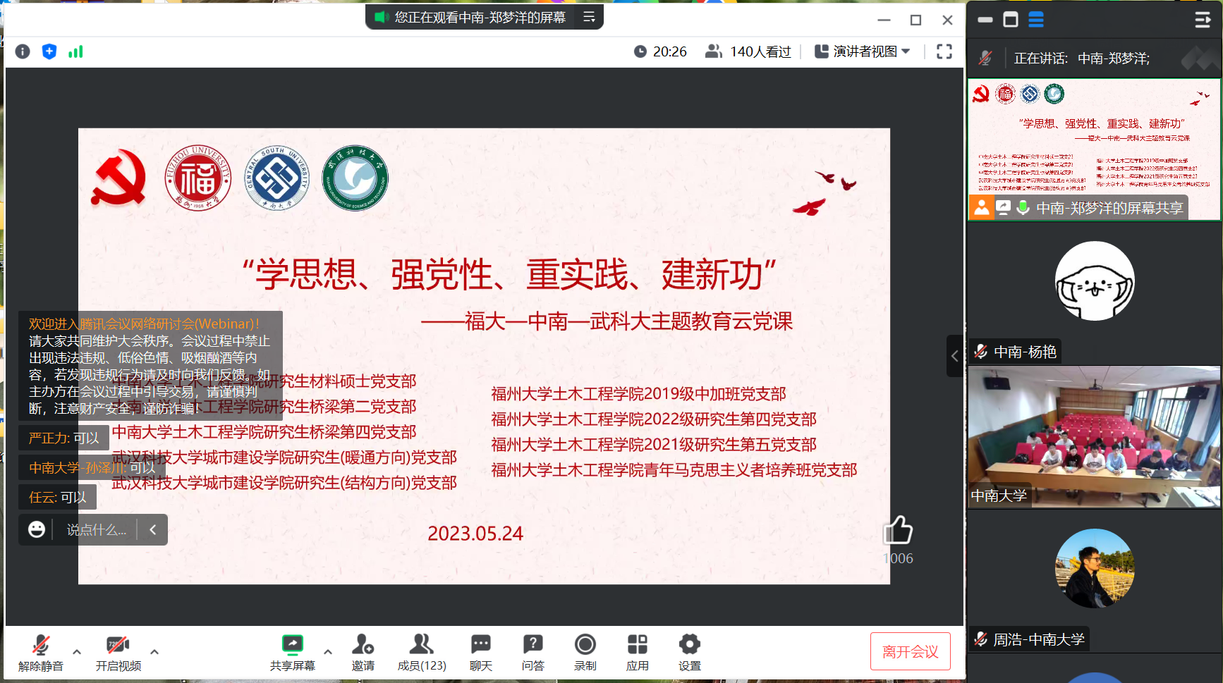 为进一步学深悟透习近平新时代中国特色社会主义思想,武汉科技大学城市建设学院研究生(暖通方向)党支部书记刘香妤以详实的数据支持、生动的语言表达,围绕党的二十大胜利召开的重大意义、精神内涵等内容做了深入浅出的阐述。并鼓励青年应当立志做有理想、敢担当、能吃苦、肯奋斗的新时代好青年,把党的二十大作出的各项战略部署转化为实际行动。
