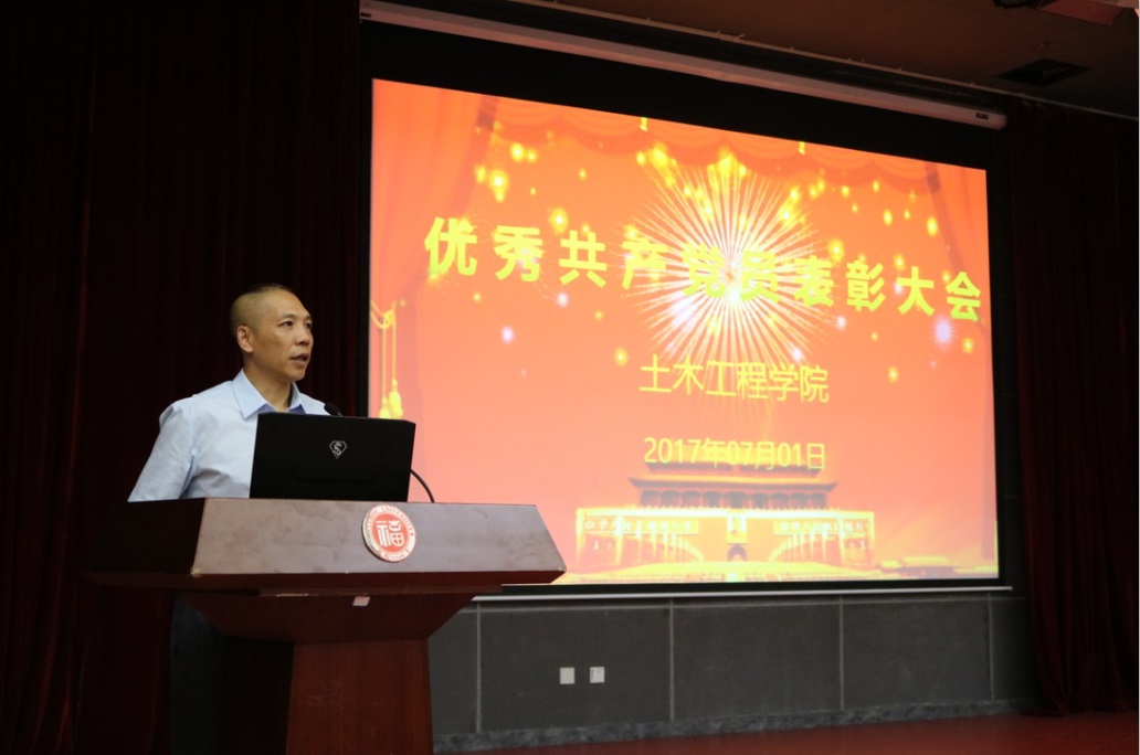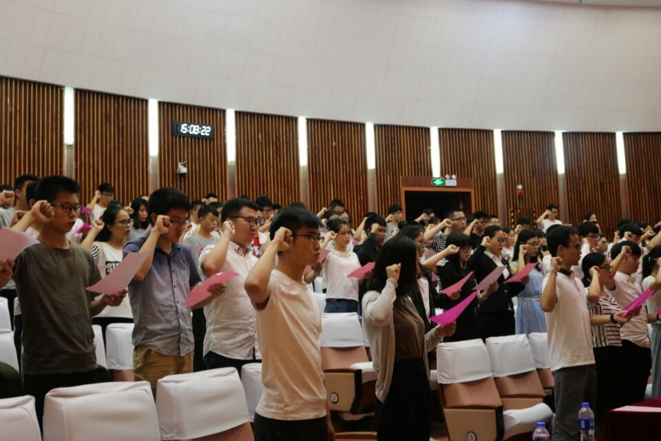 2017年七一入党宣誓暨优秀党员表彰大会在图书馆明德厅隆重举行。莅临本次大会的领导老师有:学院党委副书记余飞、党委委员兼团委书记许长宾、各年级辅导员,参会学生有:优秀学生党员代表,一年来发展入党的党员和全体学生党支部书记,会议由许长宾同志主持。