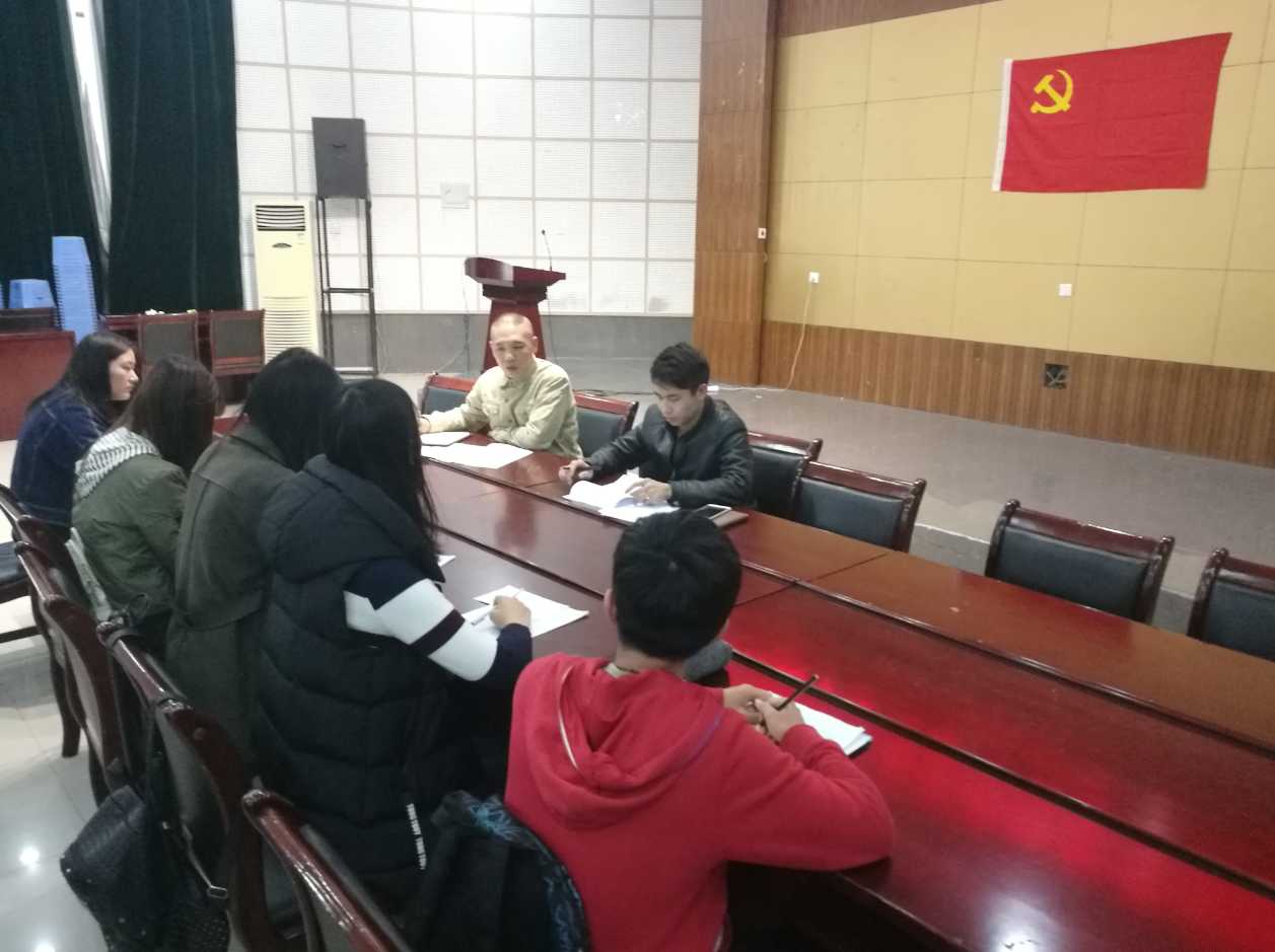 党委副书记余飞,2016级党支部书记李坤皇同志,辅导员李小倩同志及研究生党员与预备党员吕诗德同志。这次会议主要议程是讨论预备党员吕师德同志转正事宜。