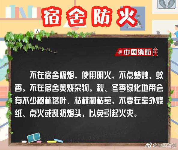 1.有序放置物品。宿舍内应整齐干净,不要随地乱扔、随地乱放物品。要及时清理宿舍垃圾,及时打扫宿舍卫生,不给任何“火灾小苗”留下“可燃之机”。