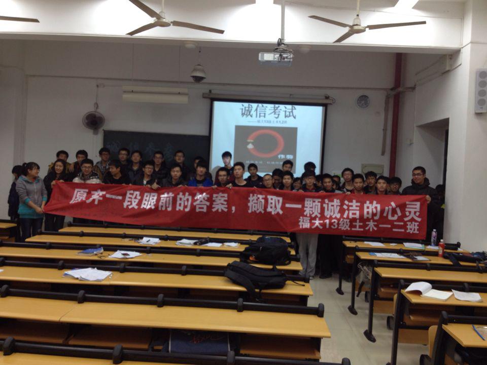 这次系列活动的开展,有助于同学们增加诚信考试的观念,规范同学们考试行为。希望各位同学在大学的第一次期末考试中,考出自己的水平,不仅是成绩,还有道德。最后,预祝大家考出让自己满意的成绩。(福大土木2013级年级记者团杨凌康供稿)