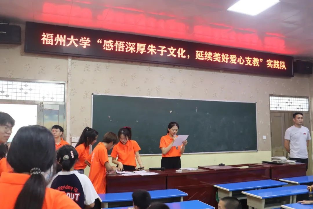 深入贯彻思想,延续爱心支教。为深入学习贯彻习近平新时代中国特色社会主义思想主题教育,响应省教育工委在全省开展“追寻领袖足迹感悟思想伟力”社会实践活动和开展“习近平总书记与大学生在一起”学习分享活动的要求,7月9日至15日,我校“感悟深厚朱子文化,延续美好爱心支教”实践队赴三明市尤溪县,开展暑期“三下乡”社会实践活动。实践队员结合专业特色,依托暑期夏令营,着眼于文艺兴趣培养、文化启蒙教育等方面,帮助孩子们增长学识、陪伴孩子健康成长。