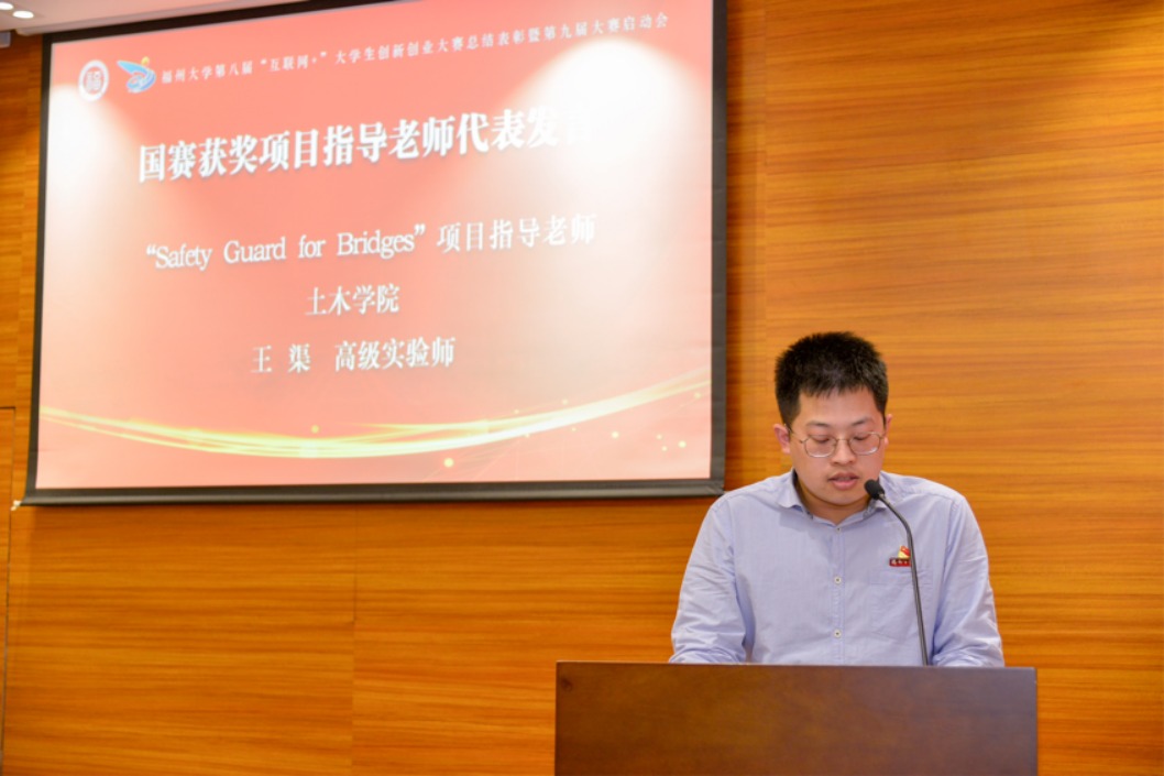王渠老师作为“Safety Guard for Bridges”项目指导老师代表发言。王渠老师先结合项目本身,对“互联网+”大赛的意义、要求等进行了详细解读;后结合自身比赛指导经历,对项目情况、参赛收获以及项目进一步的发展推进等进行分享交流。他最后表示,支持大学生创新创业要以人才培养为根本,建好师资队伍,激发青年学生创新创业热情,全面提升大学生“三创”能力。