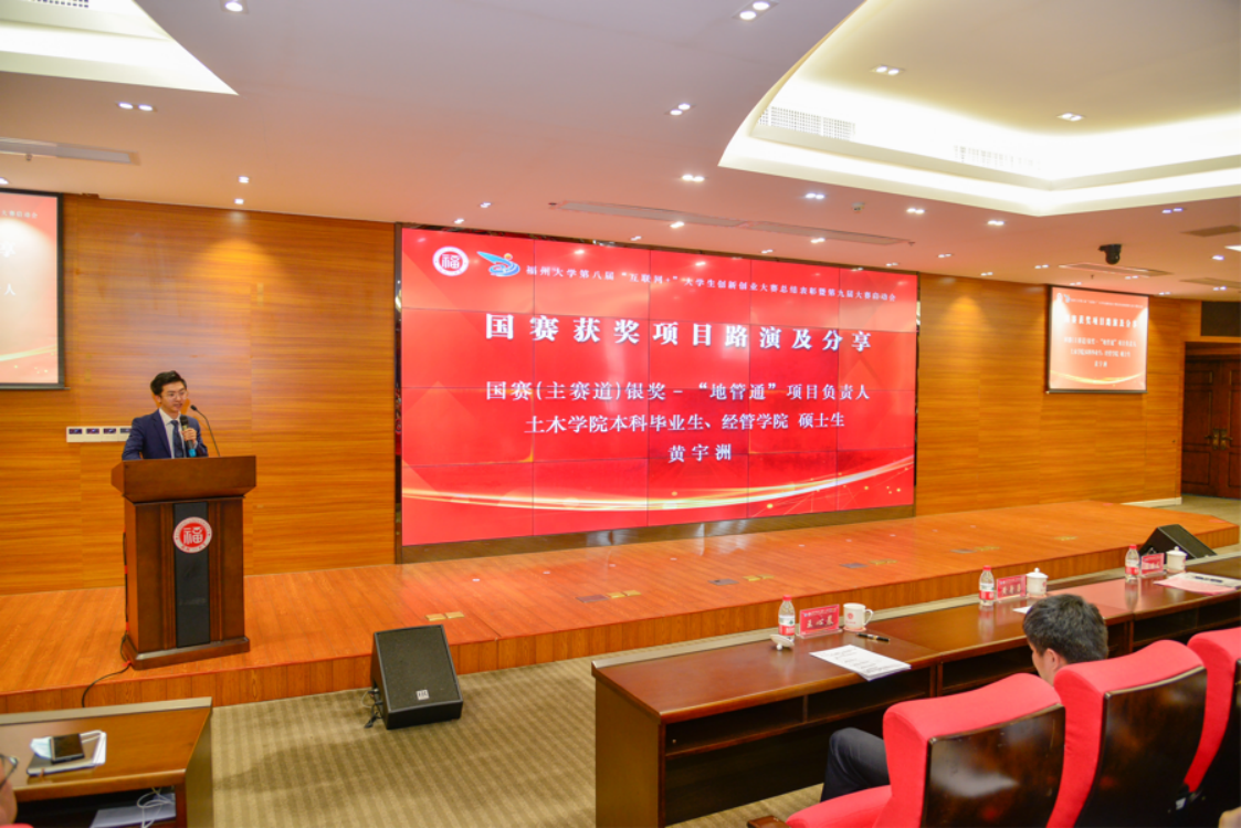 颁奖仪式后,“地管通”项目负责人黄宇洲同学进行了项目路演,为准备参加第九届“互联网+”大学生创新创业大赛的学子做了一个优秀的示例。黄宇洲同学从项目亮点等方面对“地管通”项目进行了全方位的展示,并在路演结束后就参加“互联网+”大学生创新创业大赛的要点进行了相关经验的分享。他指出,项目的创新要与国家政策、市场痛点相结合;需树立不断革新的理念,砥砺前行,坚持突破创新;项目要做到“落地生根”,在社会就业、教育等方面起到示范引领的作用……希望更多项目能够以这次路演的优秀项目为榜样,敢闯会创,再续辉煌!