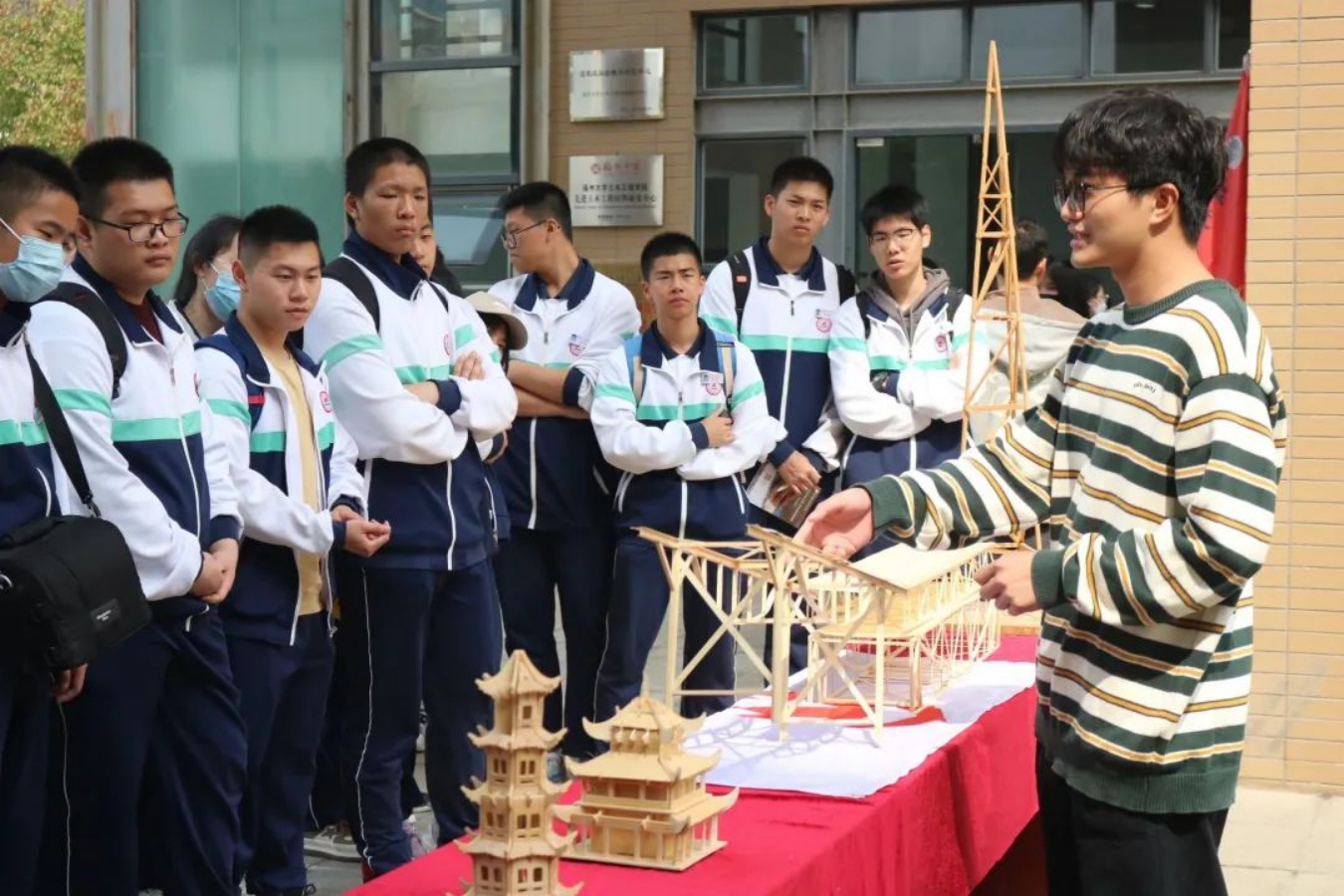 老师和同学们的带领下,格致中学师生一行参观了建筑与结构协会的桥梁结构、高层抗震结构模型,在会长林毅腾同学的讲解下,同学们对模型设计、搭建、力学知识的运用有了更加深刻的认识。
