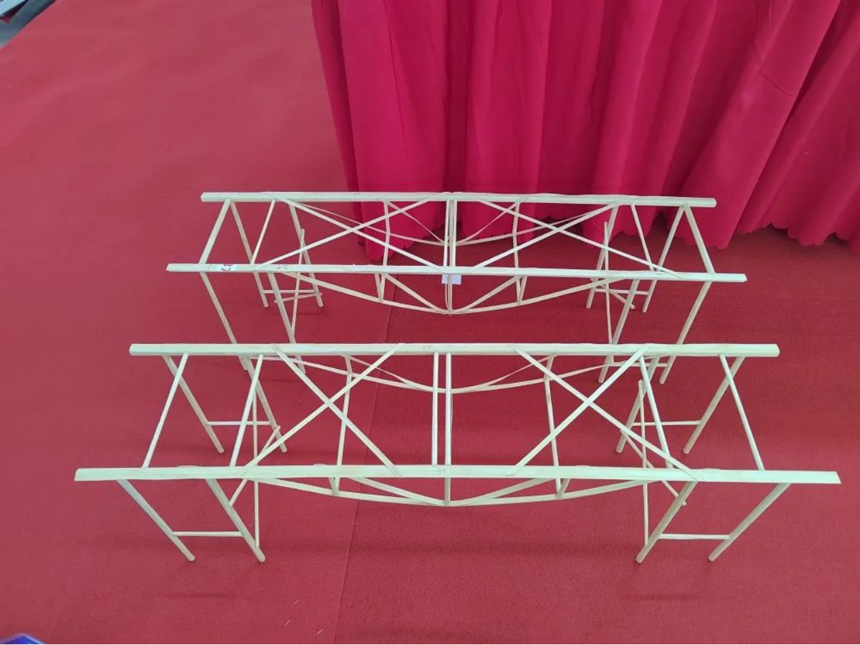 学子对赛题进行充分思考分析,手工制作的鱼腹式桥梁结构模型均控制在100g左右,成功加载18kg的荷载,以优秀荷质比名列前茅。