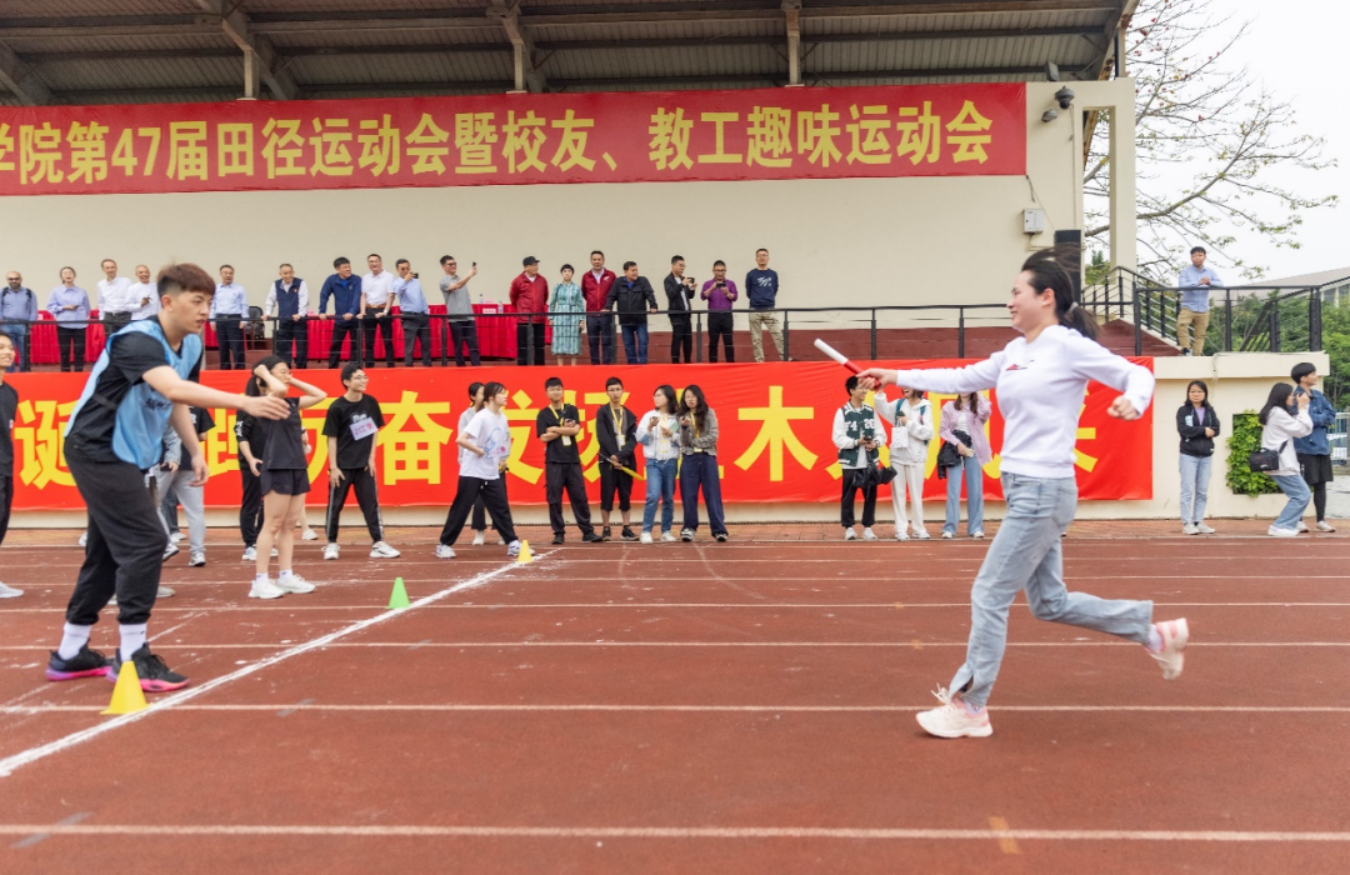 本届院运会的第一个项目是50米迎面接力比赛,广大校友、教职工、学生各自组成10人队伍踊跃参赛。林键副校长、程玉敏会长、应自明校友为首场比赛鸣响发令枪,随着发令枪响起,运动员们如离弦之箭冲向终点。赛场边,呐喊声、掌声、欢呼声,此起彼伏,持续将现场气氛推上高潮。