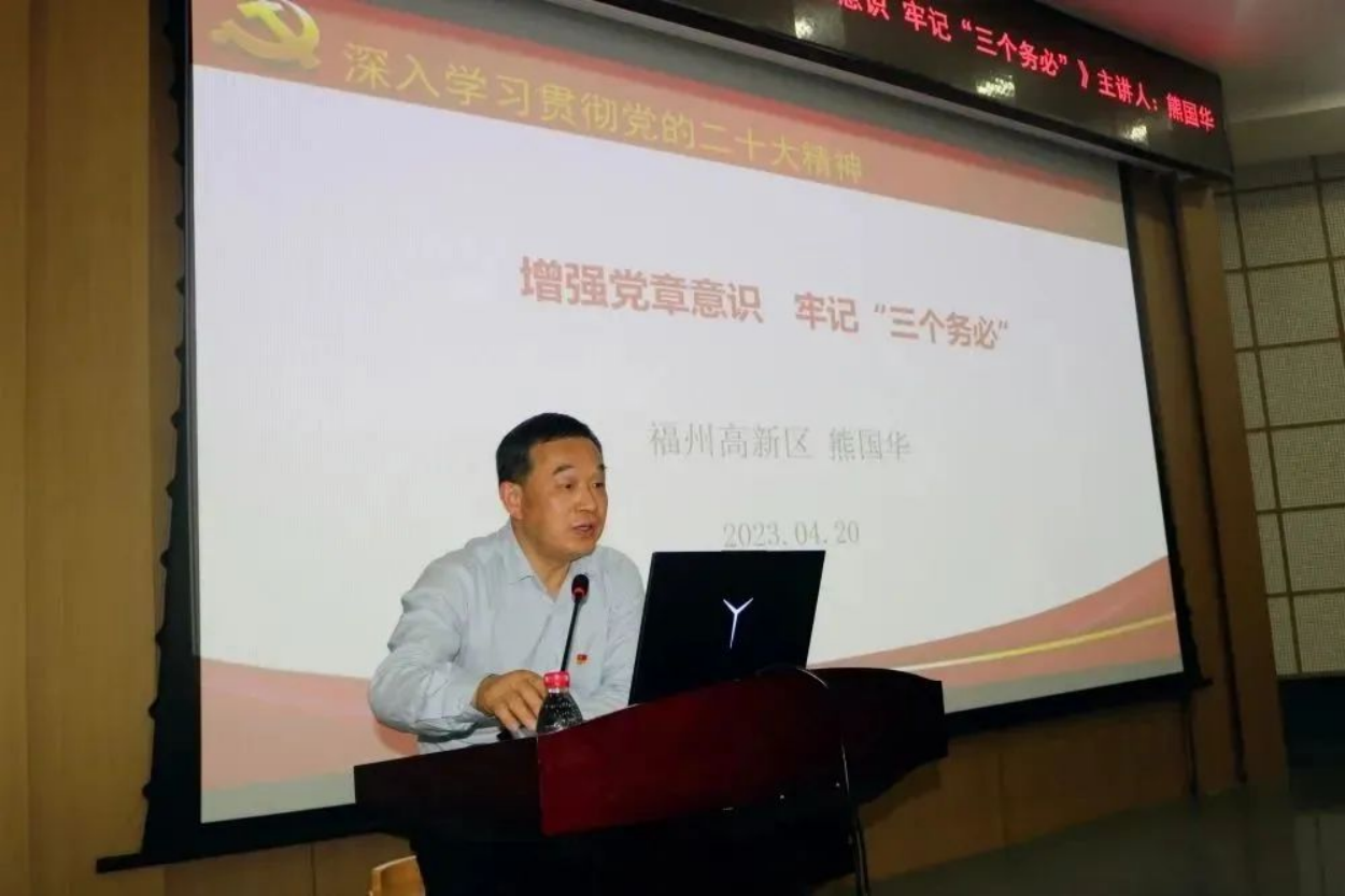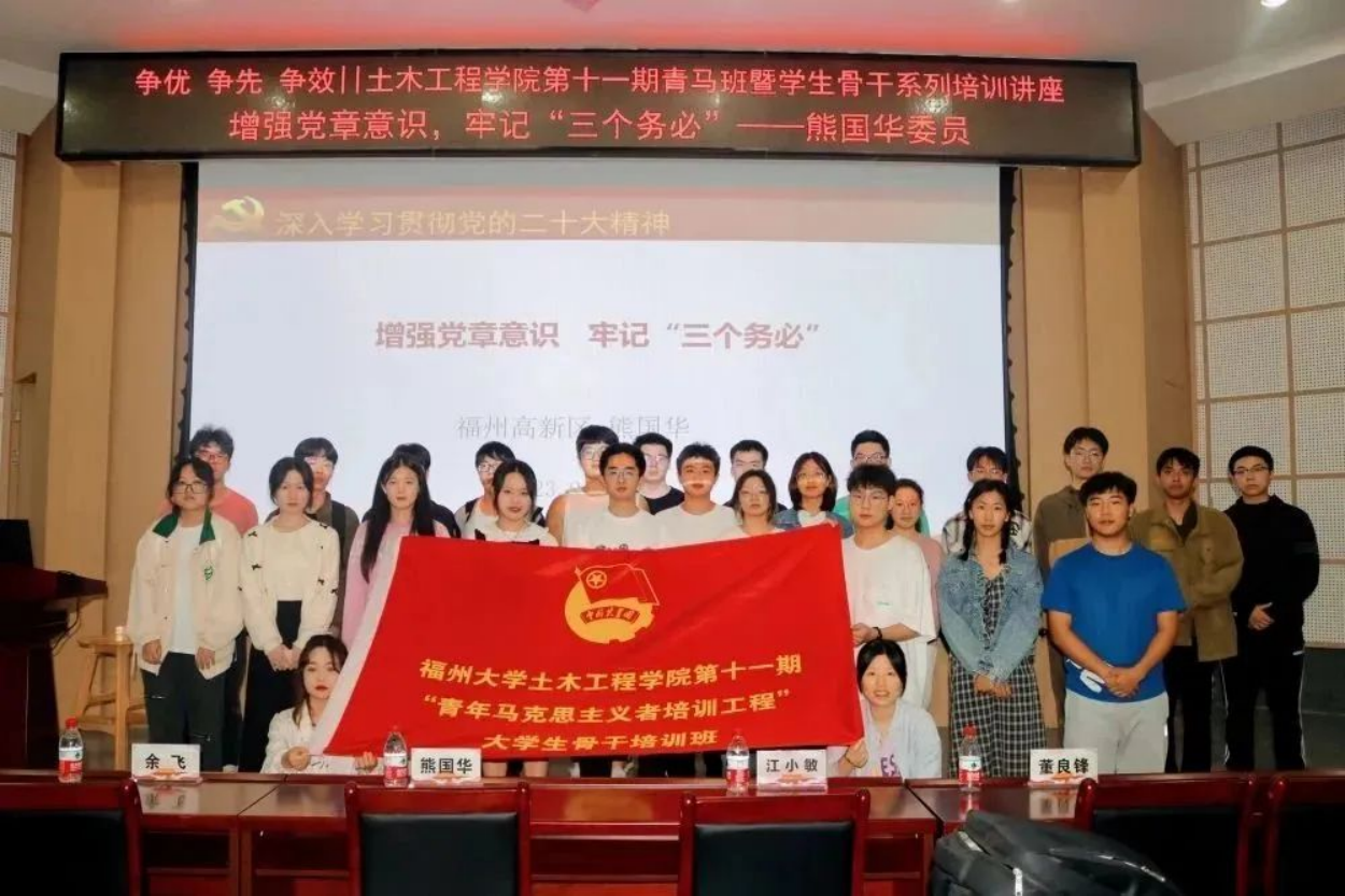 于土木多功能厅举办推进推进“三争”行动专题报告会暨第十一期青马班培训讲座,本次邀请到了福州高新区党工委熊国华委员作《增强党章意识,牢记“三个务必”》的主题讲座,讲座由院党委副书记余飞主持。