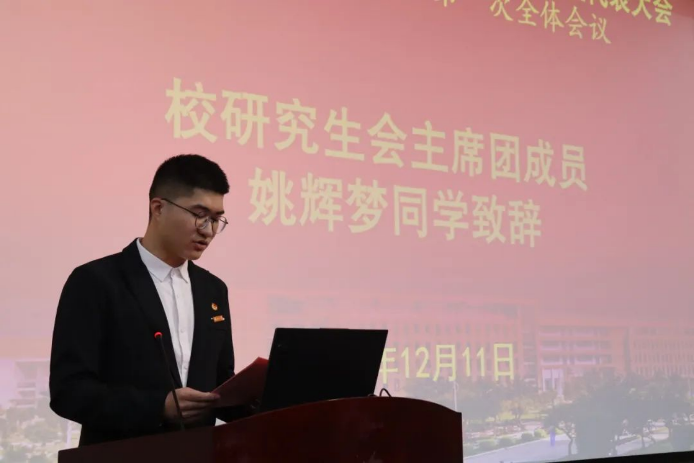 开幕式上,姚辉梦同学代表校研究生会向大会的召开致以热烈的祝贺,指出学生会组织要注重党的创新理论宣传、提高大局贡献度,突出组织的政治性、运行机制的规范性、从严治会的严肃性,希望研究生会成员要引导广大同学牢记关怀嘱托,做能吃苦的新时代好青年。