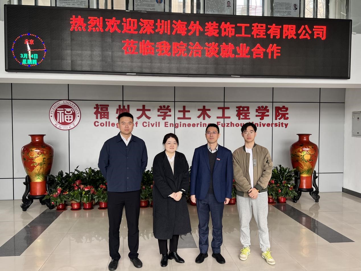 毕业生高质量就业,全面服务学生成长成才,3月14日上午,深圳海外装饰工程有限公司广东分公司办公室主任张艳、福建分公司市场营销部经理余陈伟一行应邀来访,与学院党委副书记郑寿和2024届毕业班辅导员刘荣锋深入交流毕业生校园招聘、校企合作等事宜。
