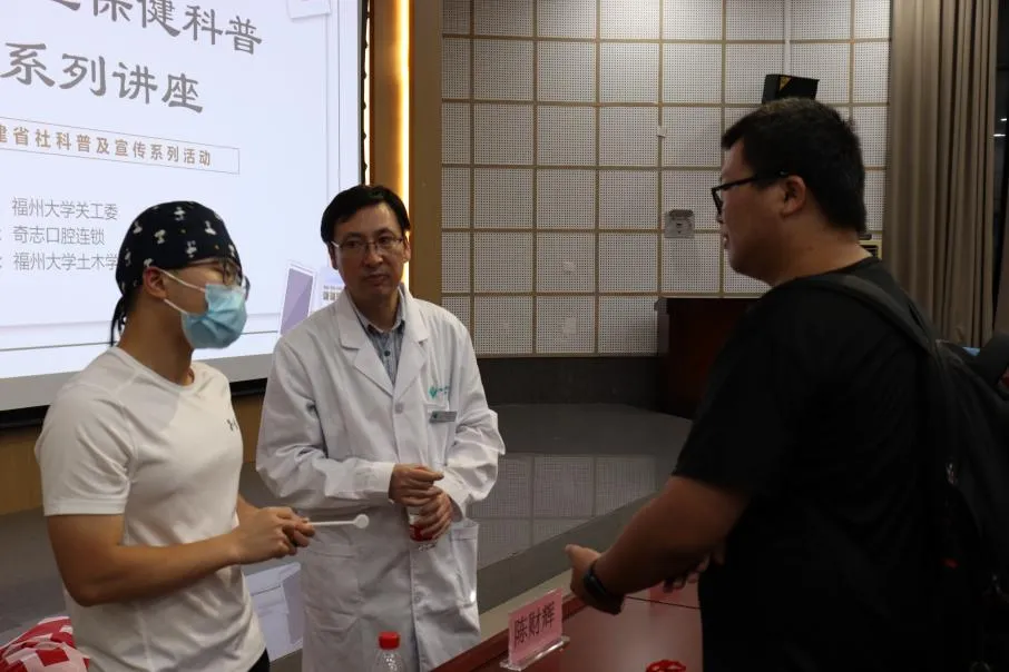 讲座过程中,刘志铭院长介绍了口腔常见疾病及其预防方式和治疗方法,并针对日常保持口腔健康方法做了详细讲解。同时对洁牙、牙齿矫正等相关知识进行了全面的科普。讲座结束后,刘志铭院长、陈财辉医生为部分学生们进行了义诊,为学生们提供免费口腔卫生检查及咨询服务,解答同学们关于口腔卫生的疑问。