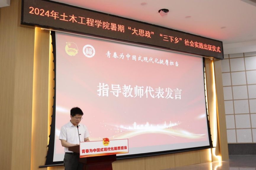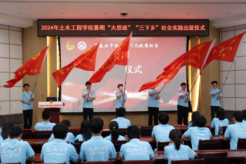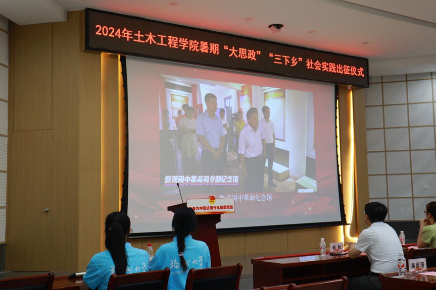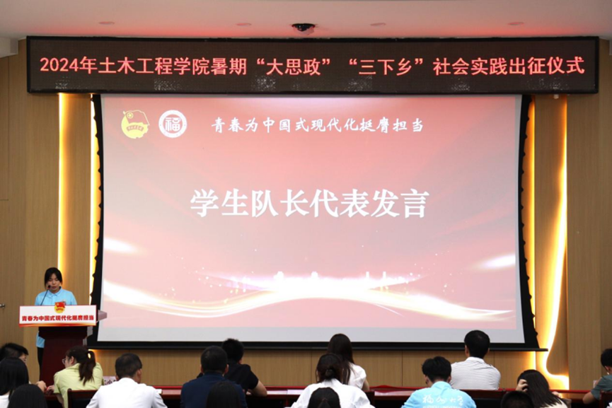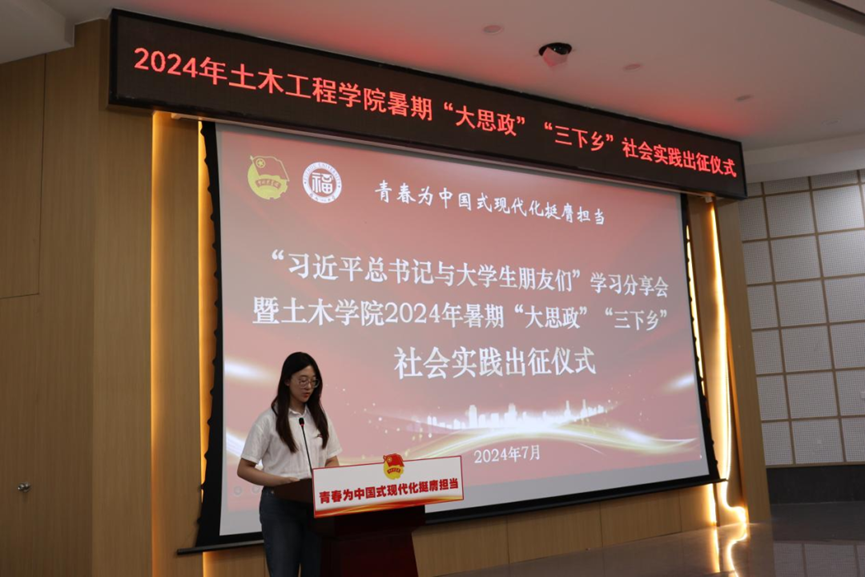 于土木学院一楼多功能厅举行“习近平总书记与大学生朋友们”学习分享会暨2024年暑期“大思政”“三下乡”社会实践出征仪式。院工会主席王渠老师,院党委组织员庄颖慧老师,院团委书记江小敏老师,路桥系教授赵秋老师,可持续与创新桥梁福建省高校工程研究中心研究员陈康明老师,土木学院博士黄宇洲、专兼职辅导员和全体社会实践队员出席此次活动。活动由吴彦漫老师主持。