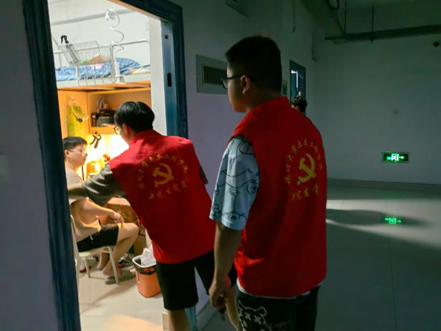 同时,学院迅速制定防台风预案,及时摸排暑期留校学生外出实习、研学情况,落实留校生去向,并及时向学生传达台风咨询,加强同学们的防台风意识。院党委副书记郑寿第一时间带领辅导员前往学生所属楼栋巡逻,深入学生宿舍开展全方位检查,排查安全隐患,逐一提醒留校学生注意防范台风,台风期间非必要不出门,关好宿舍门窗,提前收好阳台物品防止高空坠物等。