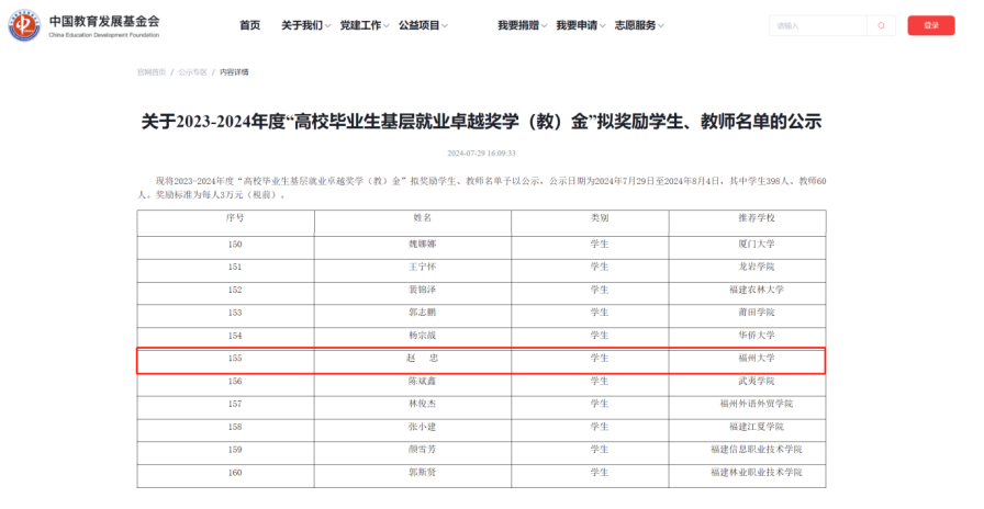 2016届交通运输专业毕业生赵忠获评该荣誉。据悉,“基层就业卓越奖学(教)金”奖励对象为赴基层就业并做出突出业绩的普通高校毕业生和普通高校指导服务大学生赴基层就业工作有突出贡献的教师,本次教育部共评选398名毕业生、60名教师,赵忠为全校唯一获奖学生。