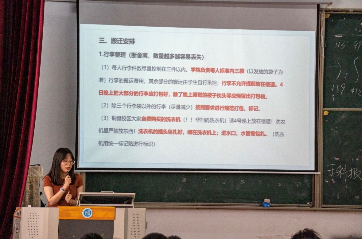 2023级本科生辅导员于铜盘校区科报厅A,向全体2023级本科生召开搬迁动员大会暨暑假返乡段会,向同学们讲解说明搬迁工作的各项具体安排与要求,确保每一位学生都能清楚了解搬迁流程与注意事项,并为同学们发放搬迁所需物料。