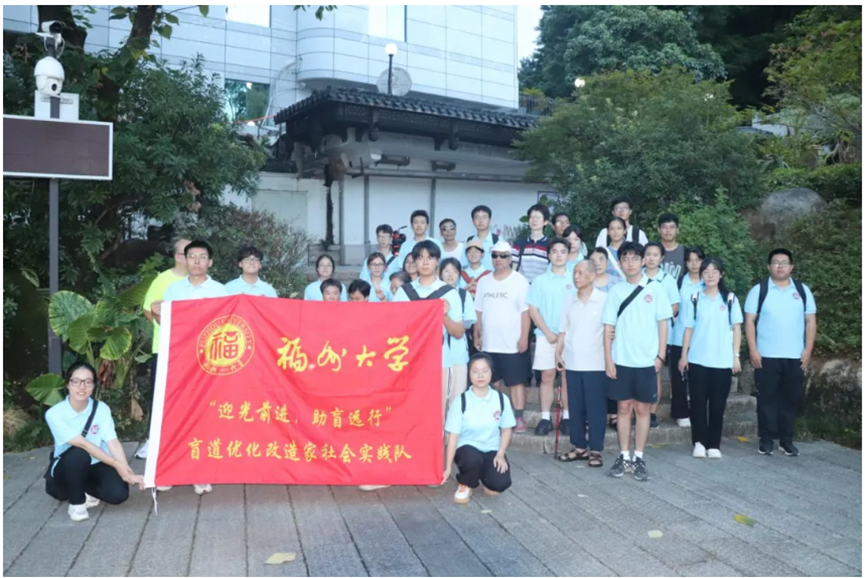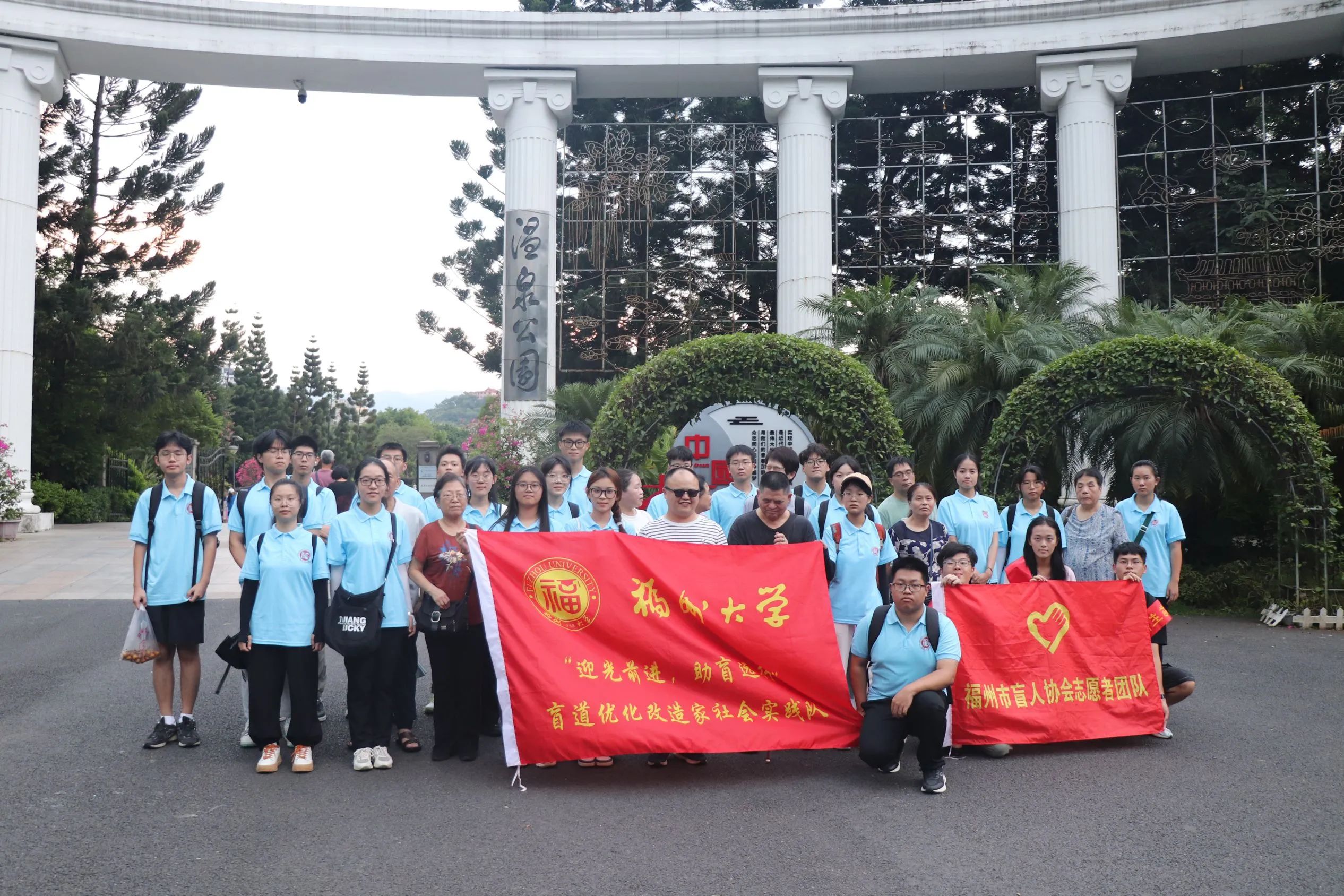 盲道优化改造家社会实践队依照福州市盲人协会的安排,接送行走不便的盲人群体并搀扶着他们游览景色秀丽的福州市晋安湖公园。这次活动不仅是为了让视障朋友们感受大自然的美好,还希望通过交流和分享,让志愿队成员获得新知识和新体验。