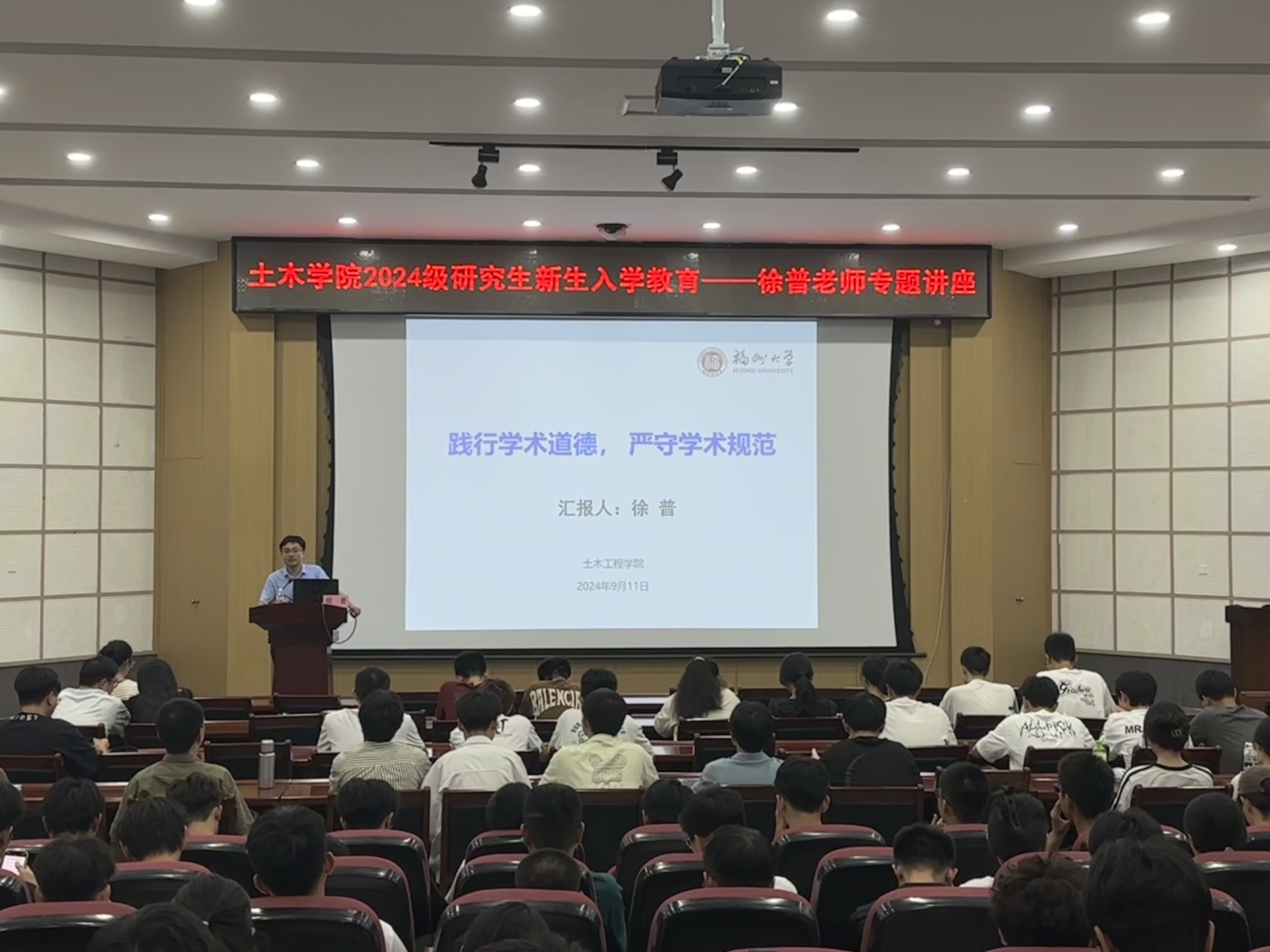 在多功能厅开展2024级研究生新生入学教育系列活动—《践行学术道德严守学术规范》专题讲座。本次讲座邀请了福建省级高层次人才、水利水电与港口工程系副主任、港口航道与海岸工程专业负责人徐普老师主讲。2024级研究生辅导员和全体2024级研究生参与讲座。