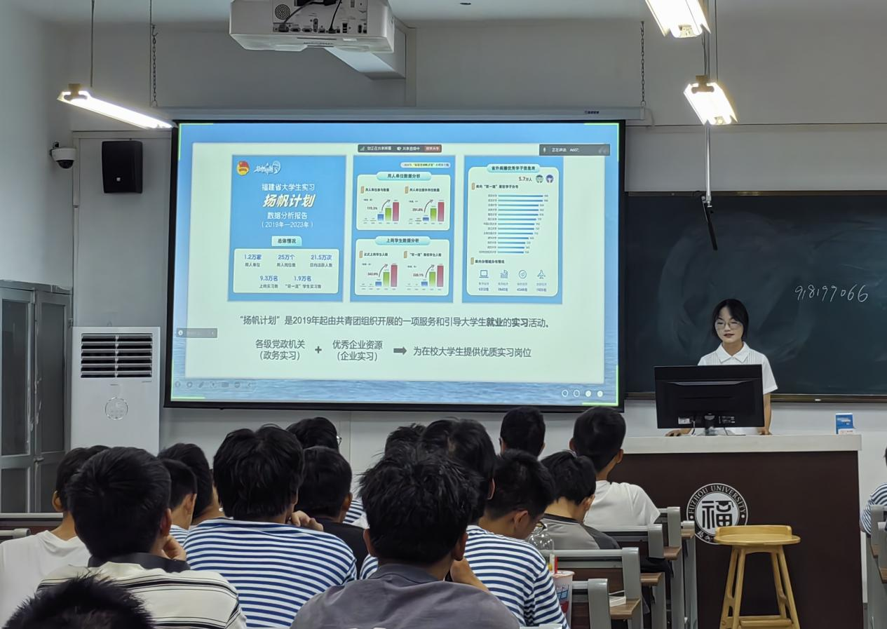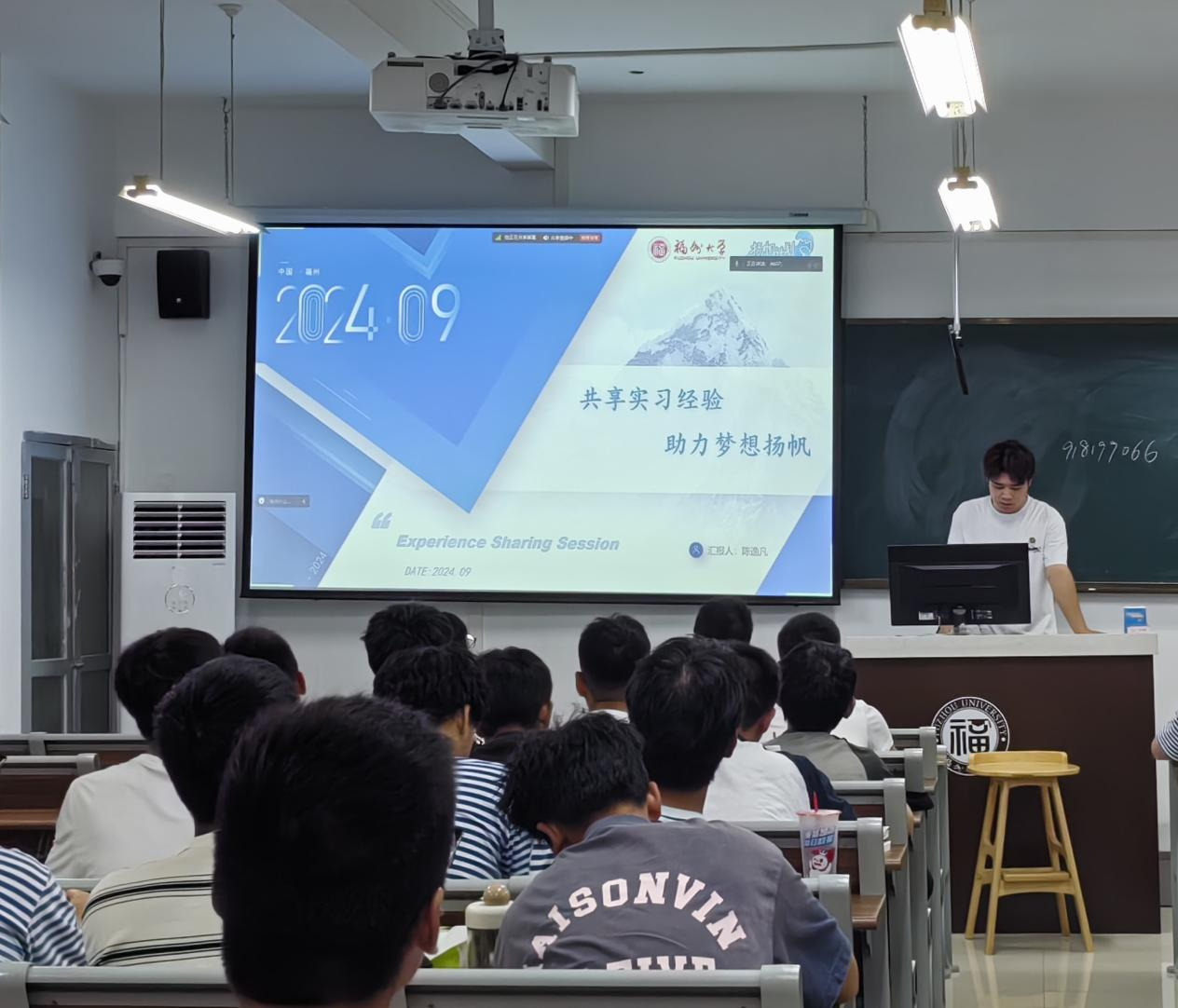 郑文圣同学首先分享了扬帆计划实习的工作内容。他通过讲述自己的日常工作任务、工作中遇到的挑战以及解决办法,展现出充实、有意义的实习生活,并且结合自身实习经历,阐述了扬帆计划实习带来的满满收获,向同学们传递“百舸争流千帆竞,借海扬帆奋者先”的人生真谛。