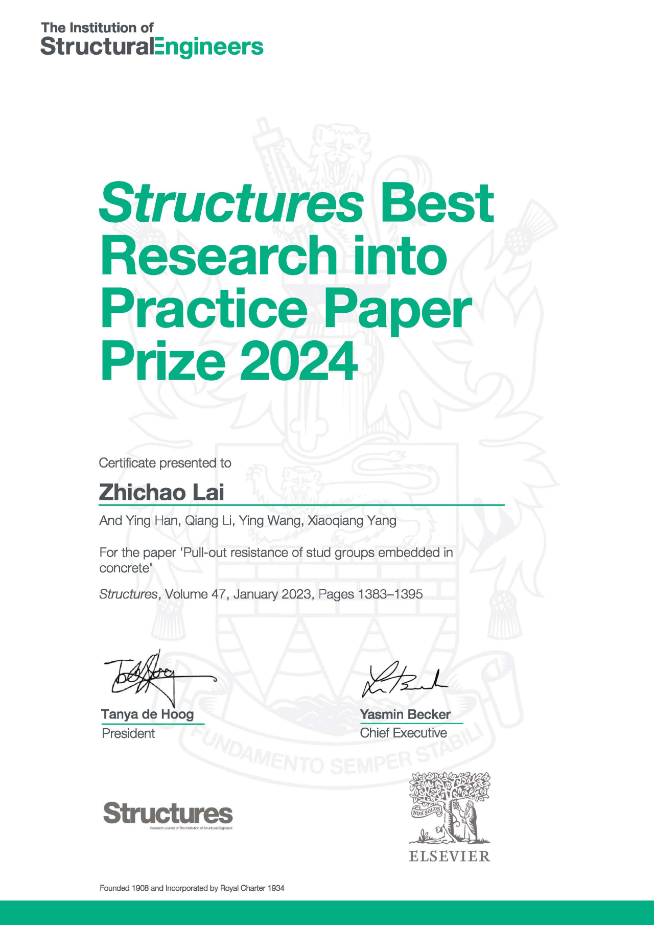 赖志超教授的研究团队喜获2024年度英国皇家结构工程师学会(The Institution of Structural Engineers)最佳应用研究论文(Best Research into Practice Paper Prize)大奖,是该奖项首次授予中国科研团队。
