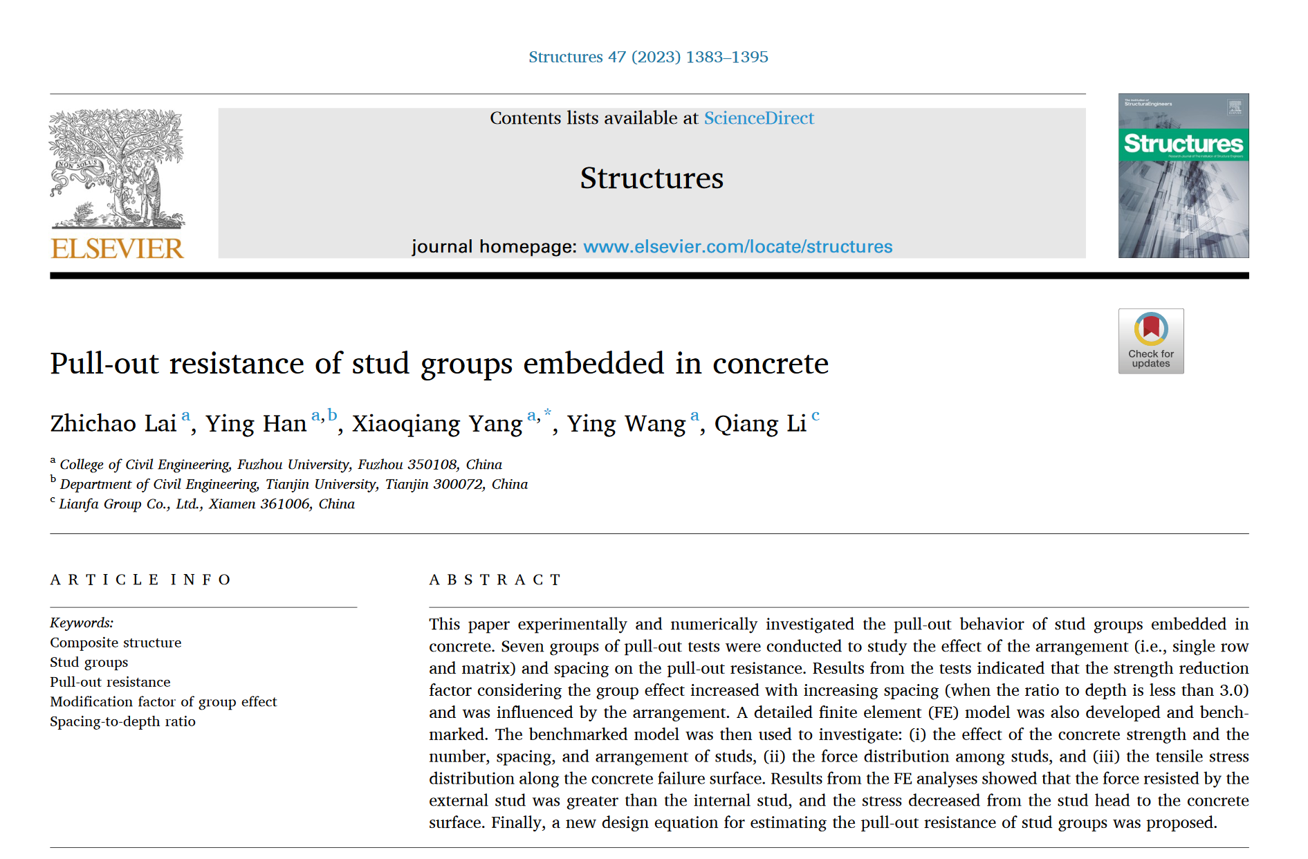 为第一署名及通讯单位,赖志超教授为第一作者,2022届硕士研究生韩颖为第二作者,杨晓强副研究员为通讯作者。该论文通过系统的试验、数值和理论研究,率先揭示了混凝土破坏面的非线性应力分布规律,阐明了栓钉群组效应机理,深入探讨了混凝土中栓钉群组的抗拔性能,并建立了成套计算理论,对钢-混凝土组合结构的设计与施工具有重要的指导意义与实践价值。