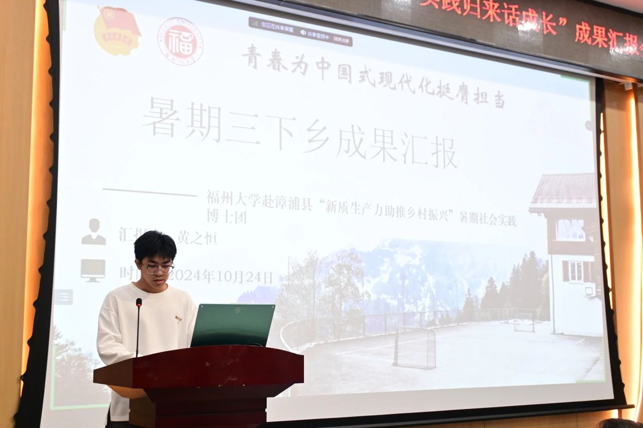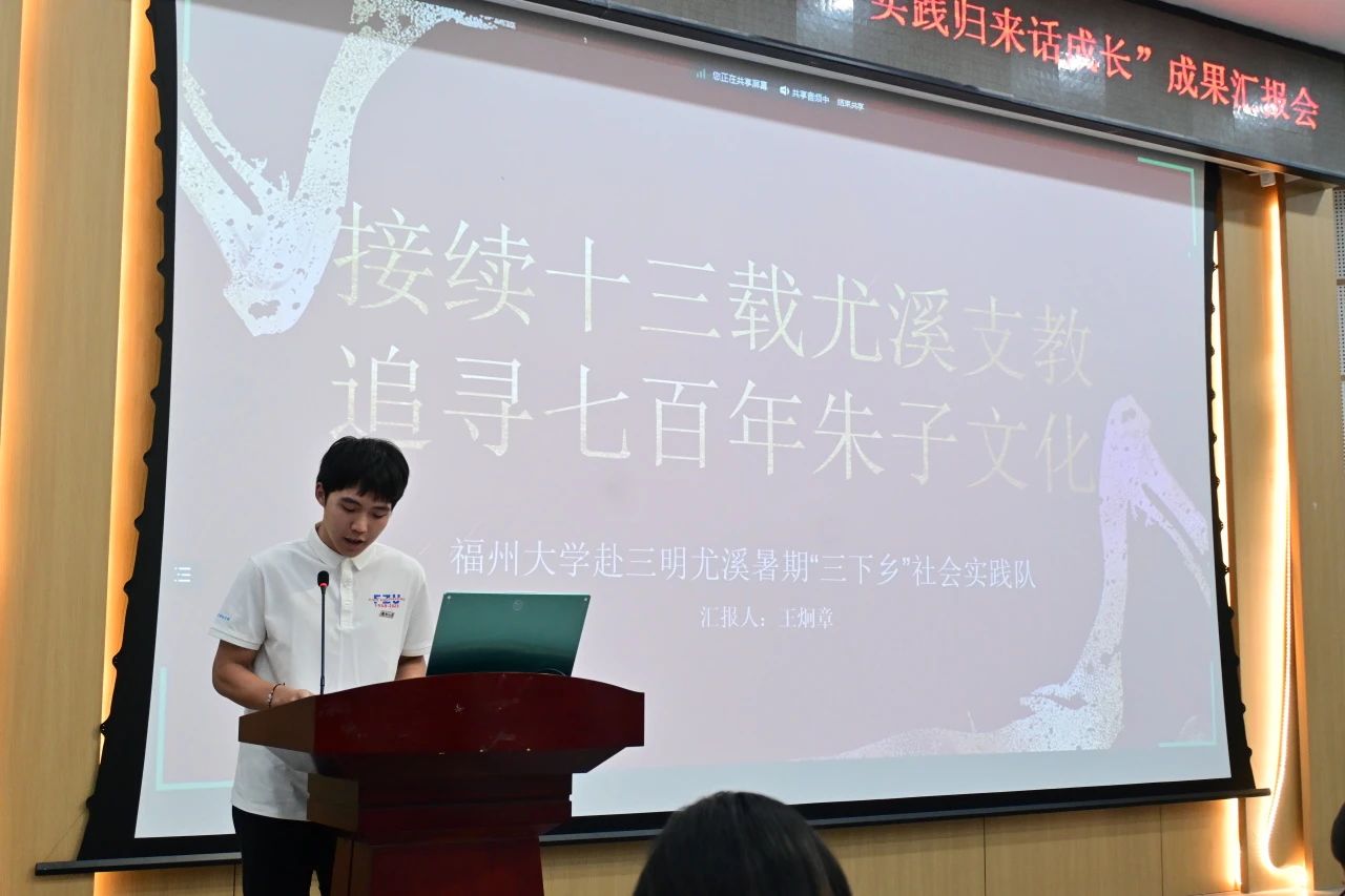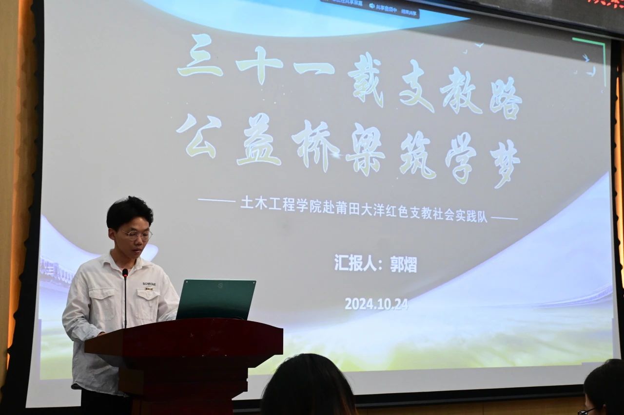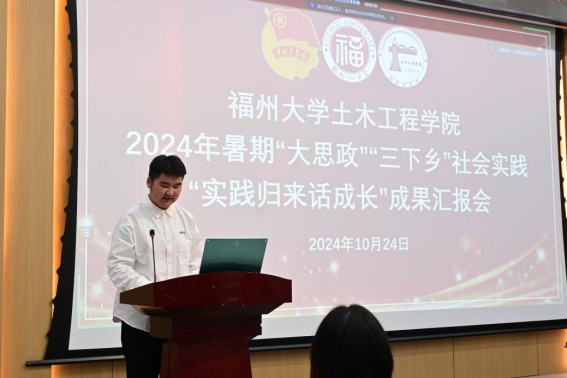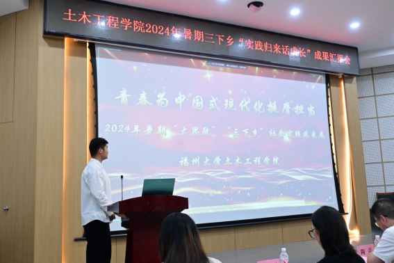 随后,六支实践队上台汇报队伍的三下乡社会实践成果。他们分享了各自的实践内容,以及在为期十几天的实践活动中收获的心得体会:与支教的小朋友友好相处、参观污水治理厂充当环境小卫士、漫步于飞檐斗拱的朱子文化园......他们用脚踏实地的行动,在生态文明建设、公益红色支教、追寻传统文化、科技驱动乡村振兴、盲道优化改造、宣传资助政策等方面贡献出自己的土木力量。