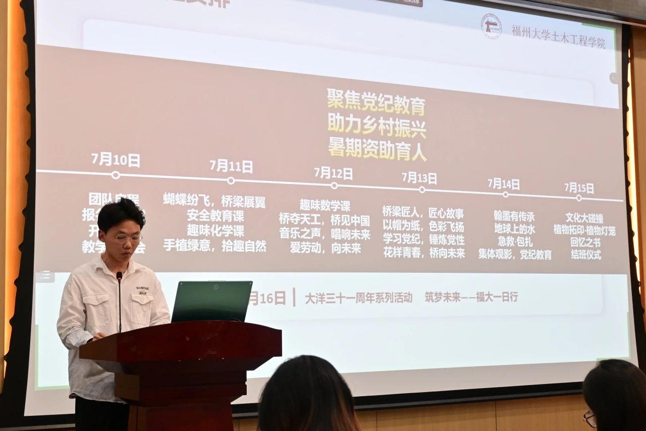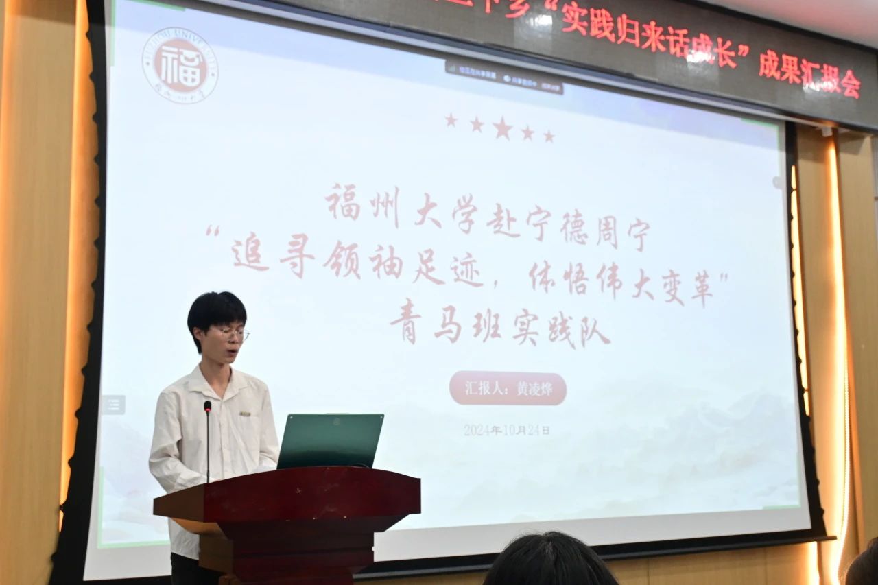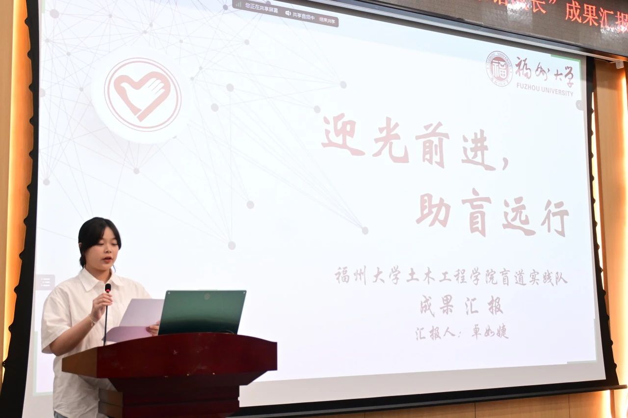 随后,六支实践队上台汇报队伍的三下乡社会实践成果。他们分享了各自的实践内容,以及在为期十几天的实践活动中收获的心得体会:与支教的小朋友友好相处、参观污水治理厂充当环境小卫士、漫步于飞檐斗拱的朱子文化园......他们用脚踏实地的行动,在生态文明建设、公益红色支教、追寻传统文化、科技驱动乡村振兴、盲道优化改造、宣传资助政策等方面贡献出自己的土木力量。
