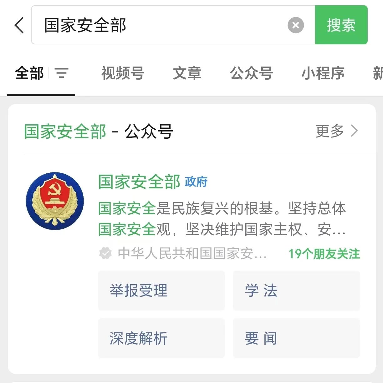 方法一 在微信中搜索“国家安全部”公众号点击关注即可。