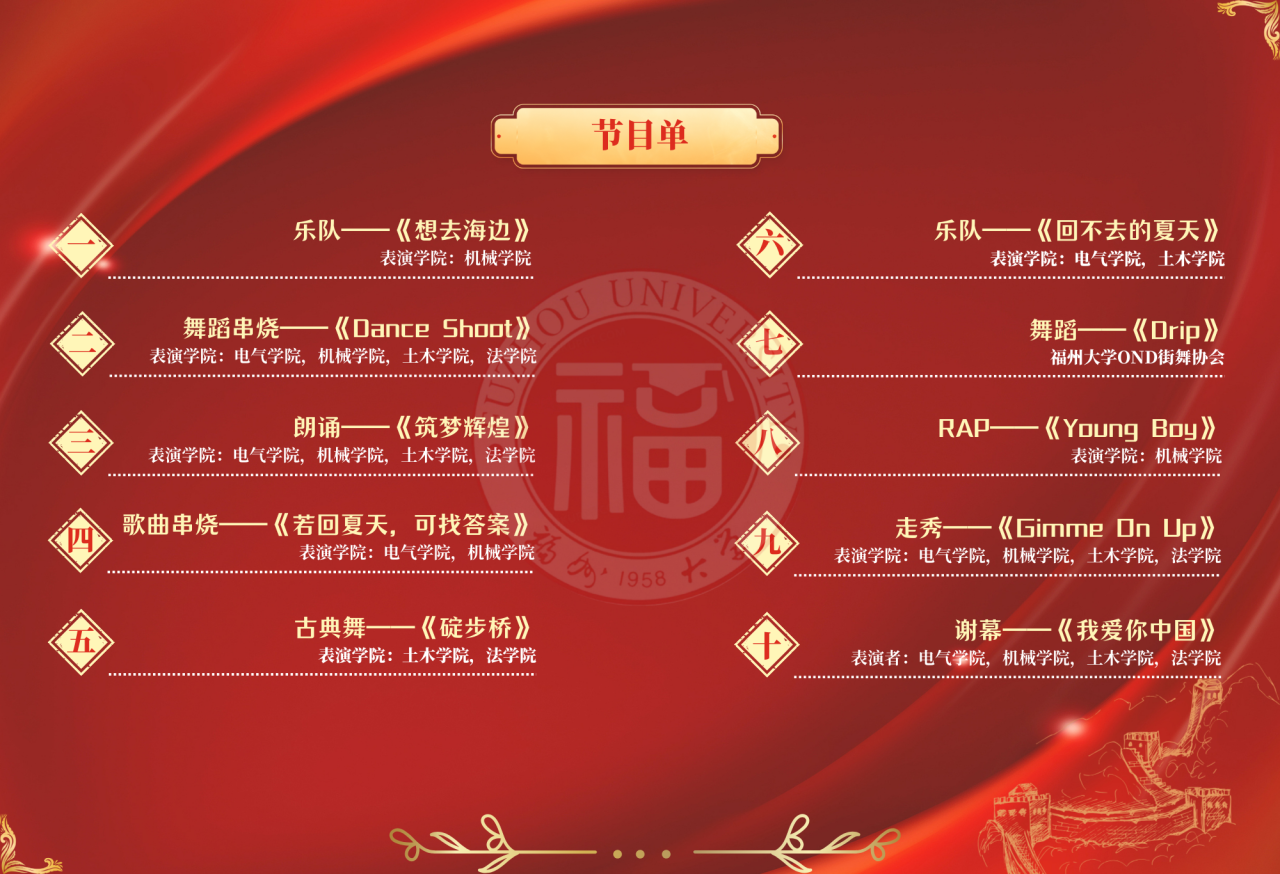 届时,您将欣赏到各个学院带来的精彩表演,感受到fzuers的才艺和热情。此外,您还可以积极参与互动环节,与来自不同院系的同学交流,结识新朋友,体验意想不到的惊喜。