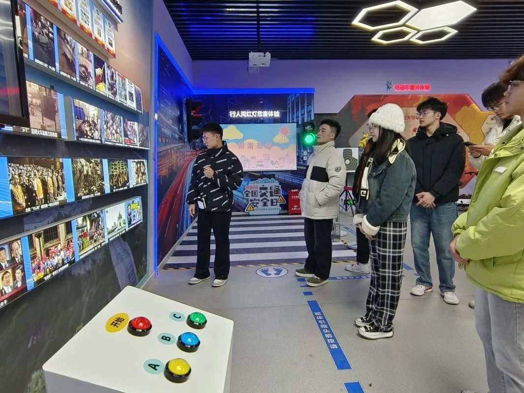 安全文化示范馆集文化性、科技感、互动性于一体,巧妙融合线上线下优势,让安全教育立体丰富,深入人心。在活动期间,自律部成员一同参观了安全文化走廊与安全教育工作风采展墙,并跟随讲解,学习自然灾害避险急救基础知识;借助模拟真实交通信号灯变化及过马路场景的智能交通设备,深刻领悟闯红灯的严重危害;借助防溺水安全知识体验系统,进一步掌握溺水急救方法,了解常见隐患,提升自我保护能力;通过仔细观察展出的仿真毒品模型,全面认识毒品种类,深入了解毒品的巨大危害,从而筑牢自觉抵制毒品的安全防线。在整场参观活动中,学院自律部成员先后进入防灾减灾、公共安全、安全生产、应急救援和校园特色五大体验区,亲身参与实景模拟、交互体验、展板学习、讲解问答,全方位巩固了校园安全知识。