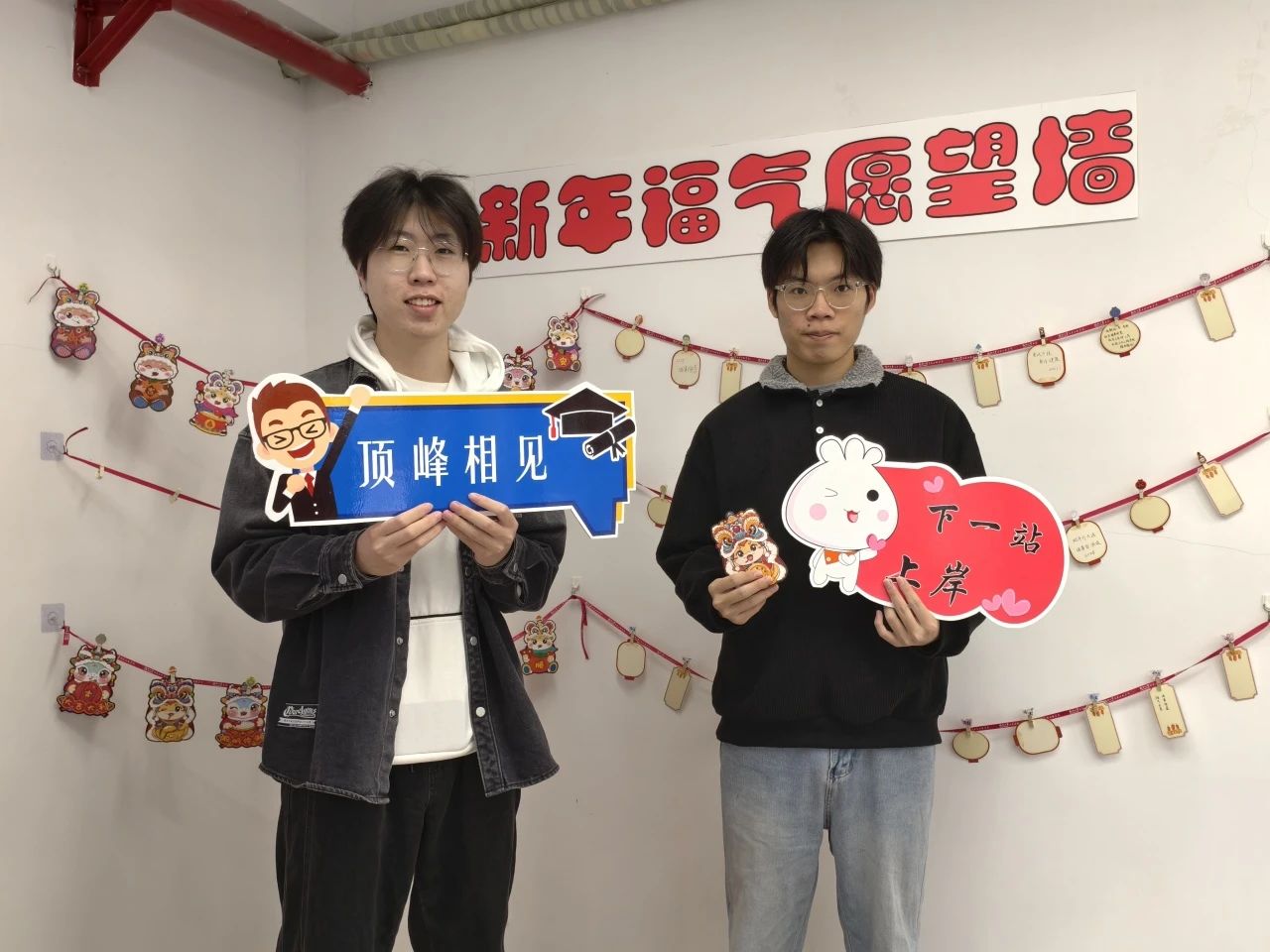 “诸事顺遂!” “身体健康,学业顺利!” “好事接蹱而至!”“上岸!” “论文录用!”心愿墙上贴满了同学们对2025年的美好期待。每一张便签,都承载着同学们对新年的希冀与祝福。