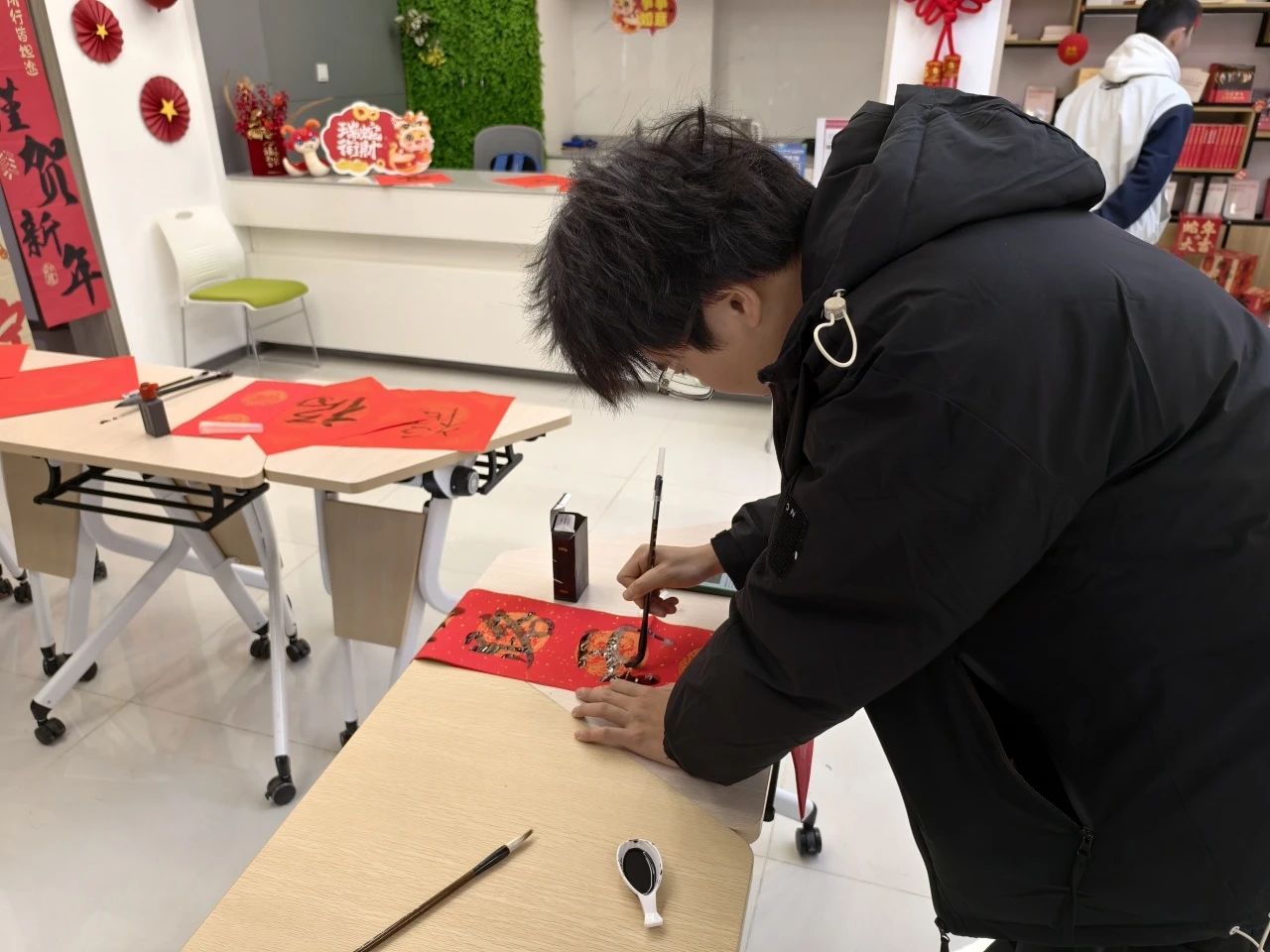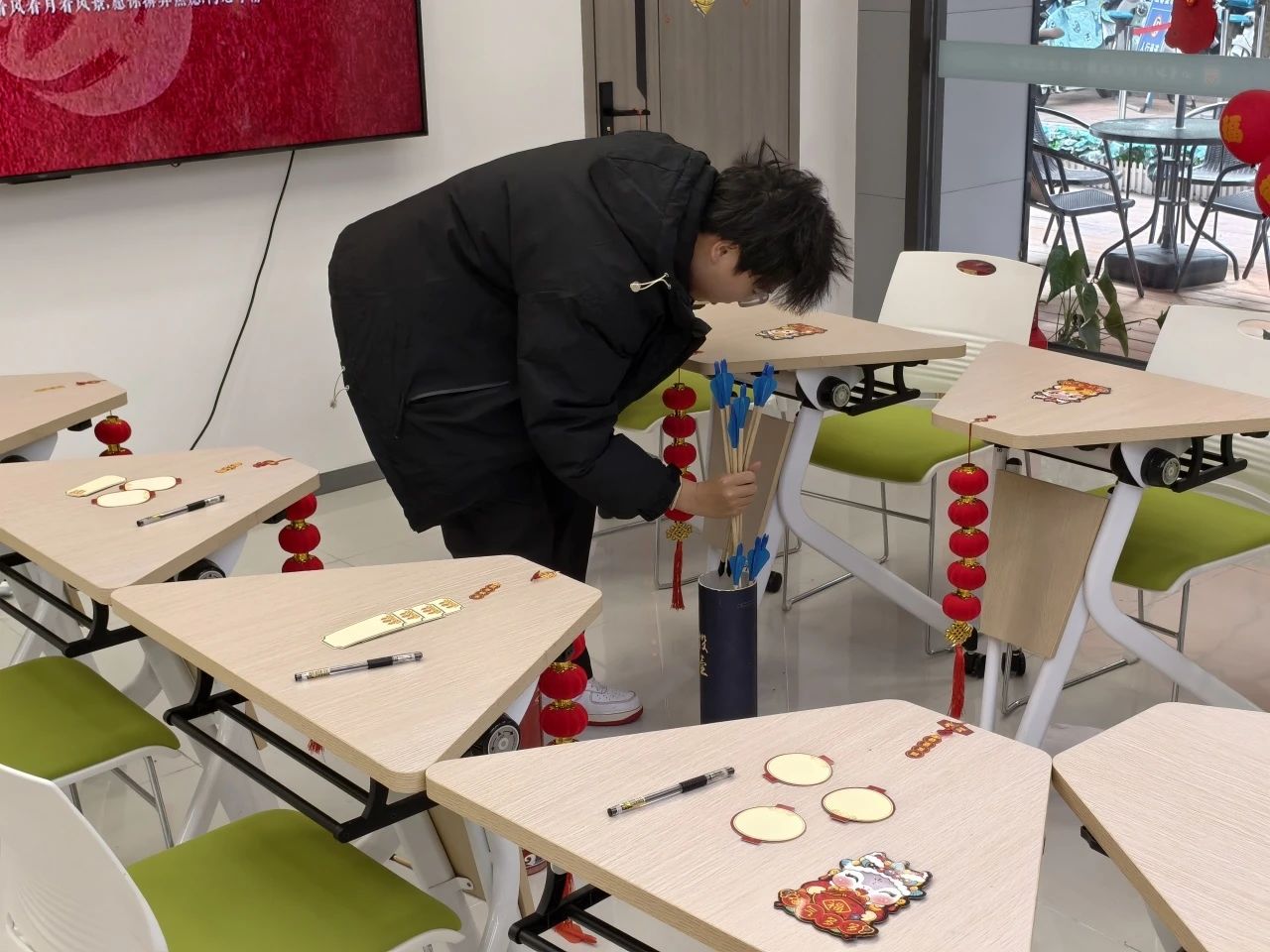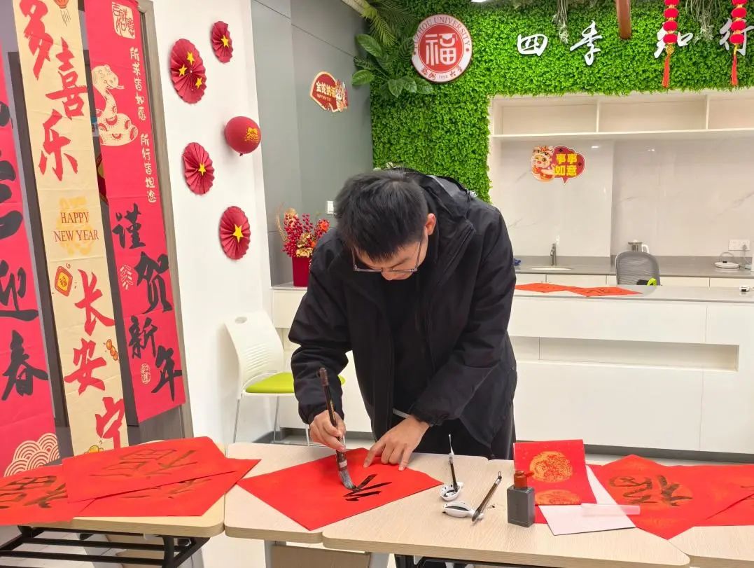 在“写对联”与“写福字”环节,同学们挥毫泼墨,用心书写出一幅幅充满喜庆与祝福的对联,将一个个饱含期盼的“福”字跃然纸上。无论是对联还是福字,每一笔都寄托着新年的美好愿望。墨香扑鼻,祝福盈怀,整个环节让大家沉浸于中华传统文化的独特魅力中。