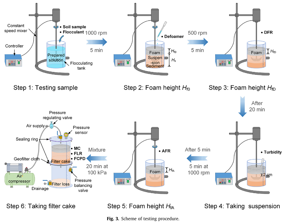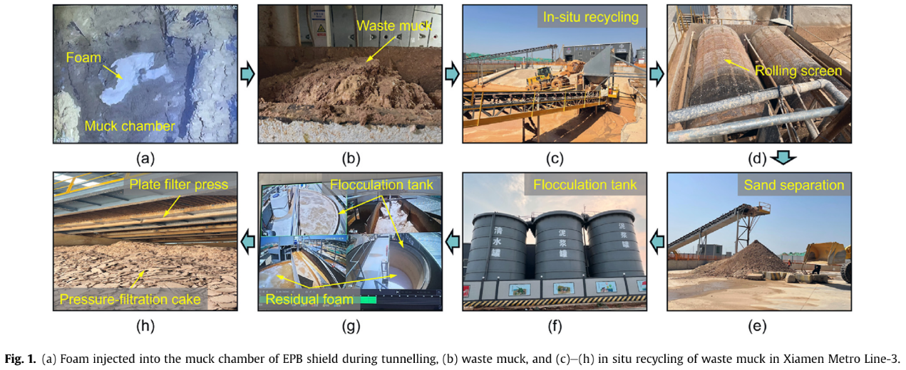 “十四五”发展规划颁布以来,我国城市轨道交通建设量迅速增长。土压平衡盾构由于操作方便、施工造价低、占用施工场地小、掘进高效等优点被广泛应用于城市地铁隧道。然而,大量的废弃渣土随之产生,常规开挖直径6米的地铁双隧道每公里废弃渣土体积可达5.7×104立方米。废弃渣土的传统处置方式是将其直接运出施工场地进行非法丢弃或者堆填。这种方式不仅会造成环境污染而且会诱发一系列的地质灾害,如滑坡和坍塌等。2015年,中国深圳某堆填场发生的一起重大滑坡事故,造成77人遇难和33处房屋毁坏。此外,值得注意的是,中国的一部分城郊堆填场已经远超其自身渣土处置能力。为此,众多学者开展废弃渣土资源化处置技术研究。其中,原位再利用是一项很有前景的渣土处置技术,通过筛分、絮凝、脱水等手段,将盾构渣土分离为砾石、砂、黏土残余物和水,以实现废弃渣土的资源化利用和运输成本节约。在土压平衡盾构掘进过程中,泡沫(改良剂)被广泛应用于改良土舱内开挖渣土物理及力学性质。废弃渣土中会残留泡沫剂组分,在原位资源化再利用过程中易造成泡沫溢出絮凝罐以及处置效率显著降低等难题。因此,厘清消泡剂、絮凝剂与渣土之间的相互作用机理,优化残余泡沫剂废弃渣土原位再利用过程中消泡-絮凝-脱水性能指标具有重要的工程意义。