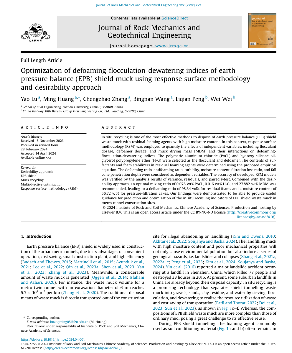 博士生路遥、黄明教授(通讯作者)、硕士生张成昭和博士生王炳楠等合作发表了题为“Optimization of defoaming-flocculation-dewatering indices of earth pressure balance (EPB) shield muck using response surface methodology and desirability approach”(基于响应面法与满意度函数法优化土压平衡盾构消泡-絮凝-脱水指标)的研究成果。该论文发表在国际岩石力学与岩土工程领域顶级学术期刊Journal of Rock Mechanics and Geotechnical Engineering上,该期刊系SCI检索期刊,JCR Q1,中科院一区TOP,最新影响因子为9.4。本研究获得国家级青年人才项目(Nos.00389335)、国家自然科学基金面上项目(Nos.52378392)和福建省“雏鹰计划”青年拔尖人才项目(No.00387088)的支持。论文链接://doi.org/10.1016/j.jrmge.2024.04.001。