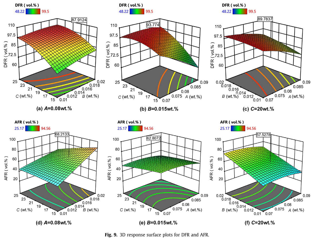 本研究结合响应面法与满意度函数法探究了PACL、H-G和MDM质量分数对于消泡率、抑泡率、悬浮液浊度、泥饼含水率及落锥贯入深度等表征指标的影响及其交互作用,主要结论如下: