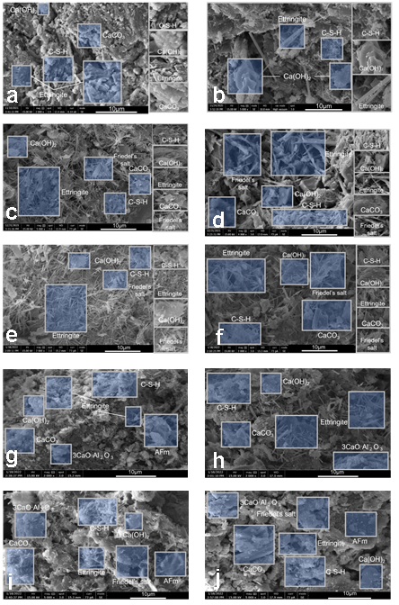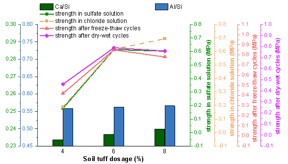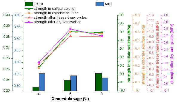 在水化反应过程中,C-S-H凝胶的数量显著增加,增强了尾矿砂颗粒之间的粘结力,提高了颗粒结构的稳定性。尾矿砂粒子之间固有的大空隙为钙矾石和C-S-H凝胶的生长提供了足够的空间。同时,由于产生了适量的水化产物,STM-LZTS比CM-LZTS表现出更稳定的强度增长。尽管改良LZTS在盐溶液侵蚀下对脱钙敏感,但STM-LZTS的降解程度不如CM-LZTS严重。这一结果归因于STM-LZTS的低Ca/Si比和高Al/Si比,这导致了致密粘合剂和坚固的非颗粒凝胶的形成。在干湿和冻融循环中,改良尾矿砂产生了丰富的水化产物,包括C-S-H凝胶、钙矾石、弗里德尔盐和二次石膏,大大延缓了外部环境因素引起的改良LZTS结构的恶化。