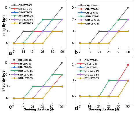STM-LZTS和CM-LZTS分别浸入Na2SO4溶液和NaCl溶液后时间完整性等级结果