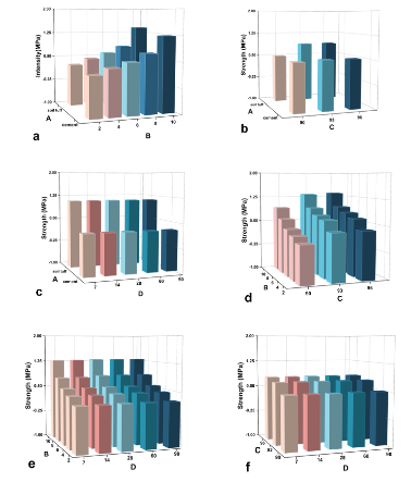 双因素交互作用下改良尾矿砂抗压强度测试结果。(a)AB;(b)AC;(c)AD;(d)BC;(e)BD;(f)CD。注:A、B、C、D分别表示改良剂类型、改良剂掺加量、压实度、养护龄期。