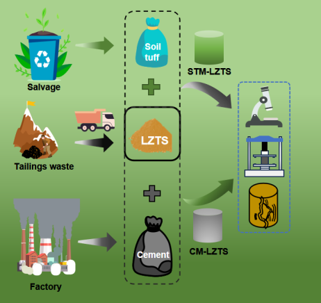 铅锌尾矿砂(LZTS)的沉积以尾矿库的形式引起了一系列问题,如土地资源枯竭、土壤结构破坏、地下水污染和颗粒物浓度增加等。统计数据显示,2021年中国铅锌矿山产量达到了1393万吨,这产生了大量的铅锌尾矿砂。这一巨大的铅锌尾矿量导致了生态环境的显著不平衡,这种不平衡将会持续甚至加剧,使得铅锌尾矿的利用成为工业和研究的热点问题。为了优化地球的土地资源,各种技术手段已经被用来改善这些土壤,以便它们可以作为道路材料使用。传统上,大多数研究集中在利用水泥和石灰等传统材料作为尾矿砂的改性剂。然而,这些传统的改良剂消耗巨大的能源,导致过量的CO₂排放,导致温室效应和环境的破坏。而土凝岩是钢渣、粉煤灰、赤泥、煤矸石等工业固废研发出的一种新型固废材料。这种废料在生产过程中能耗低,排放CO₂最少,同时表现出与传统水泥相当的性能。因此,土壤岩有望作为一种替代改性材料。但目前尚未有研究从物理性能和耐久性能的角度对土凝岩改良LZTS(STM-LZTS)进行测试。因此,作者在宏观实验和微观结构的基础上分析土凝岩改良LZTS作为路基填料的可行性。