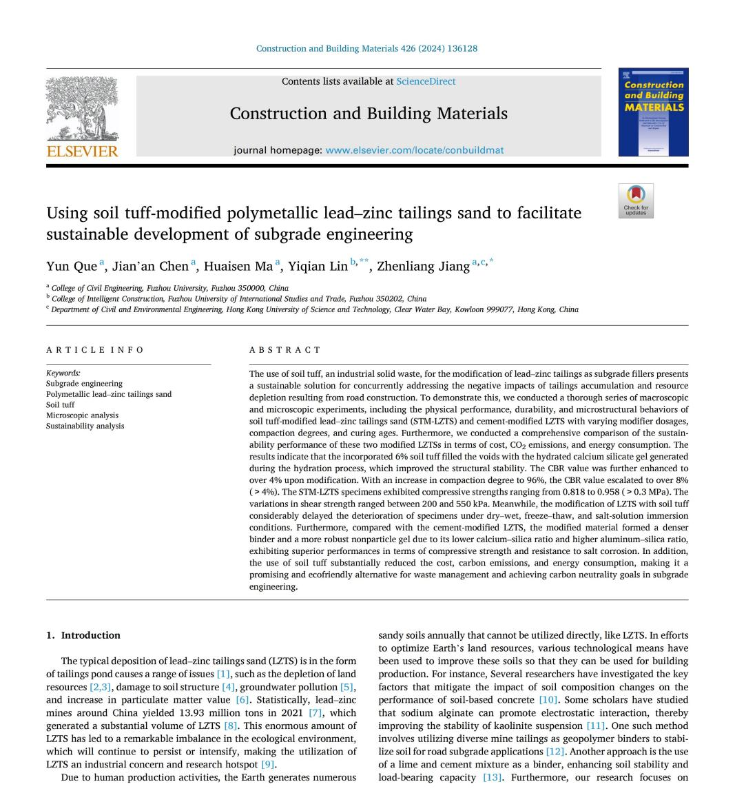 硕士生)发表了“Using soil tuff-modified polymetallic lead–zinc tailings sand to facilitate sustainable development of subgrade engineering”(利用土凝岩改良多金属铅锌尾矿砂促进路基工程的可持续发展)的研究成果。该论文发表在国际建筑和土木工程领域学术期刊Construction and Building Materials上,该期刊系SCI检索期刊,JCR Q1,中科院一区,TOP期刊,最新影响因子为7.4。本研究获得国家自然科学基金项目(No.41772297)的支持。