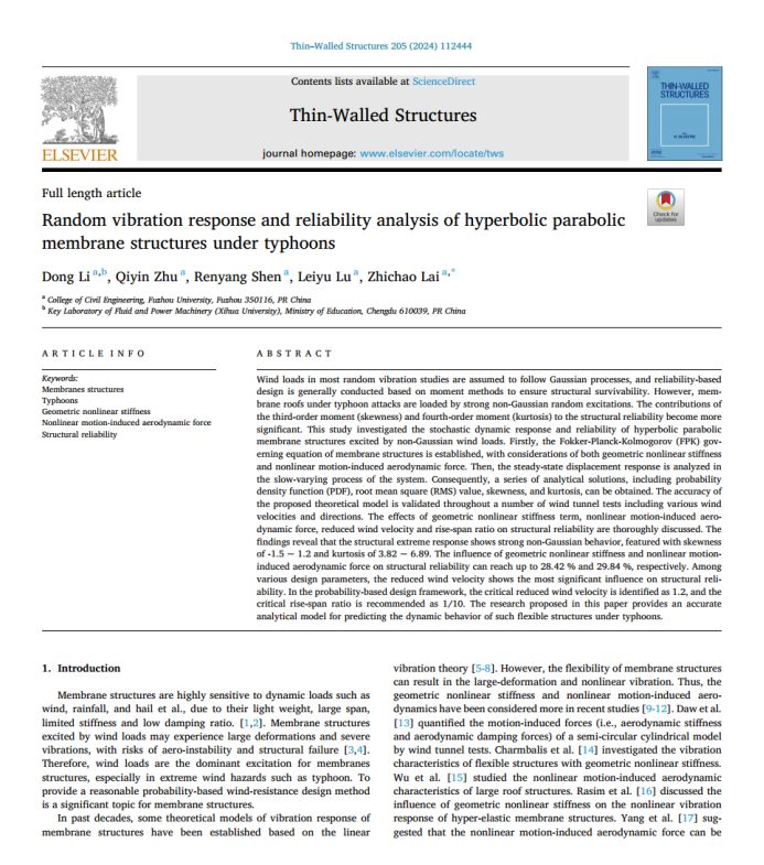 近日,李栋副教授(第一作者)、朱琪茵(第二作者)和赖志超教授(通讯作者)、等合作发表了题为“Random vibration response and reliability analysis of hyperbolic parabolic membrane structures under typhoons”(台风作用下双曲抛物线型膜结构随机振动响应及可靠性分析)的研究成果。该论文发表在国际顶级学术期刊Thin-Walled Structures上, 该期刊系SCI检索期刊,JCR一区,中科院分区一区,TOP期刊,最新影响因子为5.6。本研究获得了国家自然科学基金项目(No.52108121)的支持。