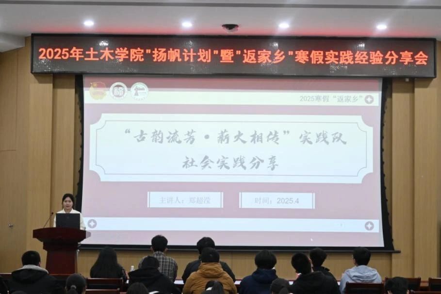 在“扬帆计划”经验分享环节,来自2024级水利水电工程的黄一杰同学率先登台,分享了在福建省南安市码头镇人民政府中实习的所见所闻,他深入基层,协助处理镇村日常事务,积极参与到镇里春节系列文化活动的组织工作当中,通过与当地居民的接触和交流,深刻意识到作为青年学子所肩负的责任。随后,来自2024级交通工程的陈莹婷同学分享了寒假在陪读营实习的宝贵经验,她以细腻的观察和深刻的思考,为大家揭示了基层组织工作中所蕴含的挑战机遇和成长空间。两位同学的分享,不仅让现场的观众们领略到了“扬帆计划”作为实践育人平台的独特魅力,更激发了同学们投身实践活动的社会责任感和报国热情。
