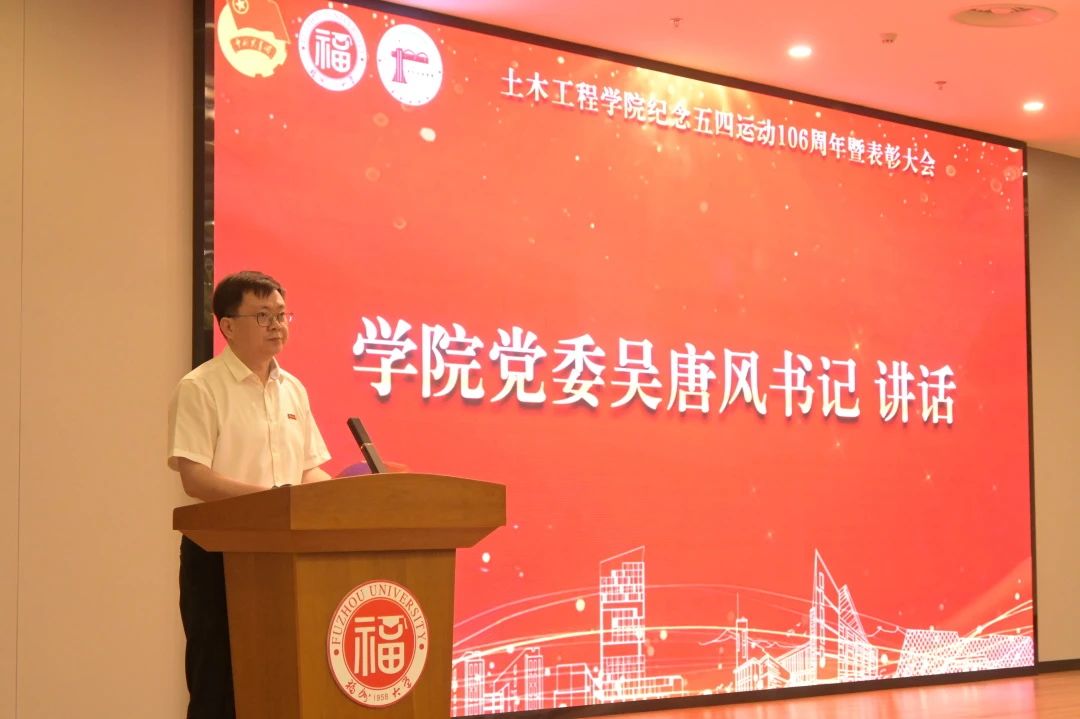 院党委吴唐风书记发表讲话。他向全院各级团学组织和广大青年朋友,致以节日的祝福和诚挚的问候!向受到表彰的先进集体和个人表示热烈的祝贺!