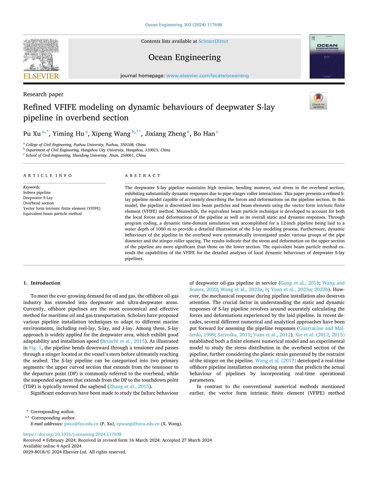 港口,海岸及近海工程专业研究生)和山东大学韩勃教授合作发表了题为“Refined VFIFE modeling on dynamic behaviours of deepwater S-lay pipeline in overbend section.”(基于向量式有限元的深海S型铺设管道过弯段动力响应精细化建模)的研究成果。该论文发表在国际工程技术领域学术期刊Ocean Engineering上,该期刊系SCI检索期刊,JCR一区,中科院分区二区TOP,最新影响因子为4.6。本研究获得国家自然科学基金(No.51809048, 52301340, U23A20663)以及福建省自然科学基金(No. 2022J01092)的支持。论文链接://doi.org/10.1016/j.oceaneng.2024.117698。