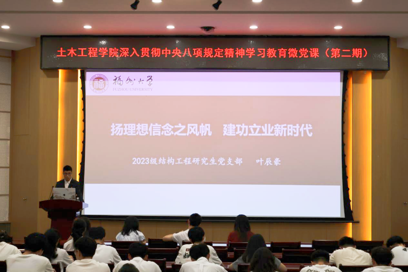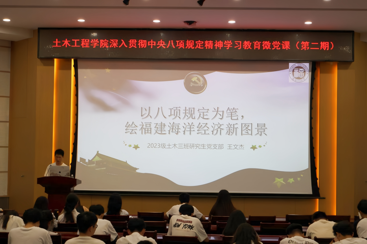 本期微党课立足时代前沿,各位党支部书记深入剖析了违反中央八项规定精神的常见问题及其表现形式,并结合自身专业特色,以“八闽大地”为样本,阐释国家战略与青年党员使命担当的内在联系,生动展现新时代区域发展的创新实践。这些兼具思想深度与实践温度的精彩讲述,充分彰显了青年党员胸怀“国之大者”的政治自觉与使命担当。