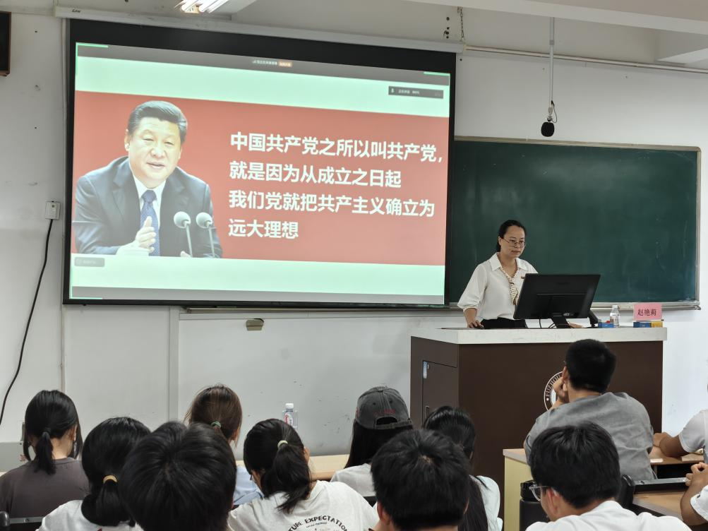 赵老师开场风格轻松幽默,以“大学生活怎么过”为切入点,引发同学们对自我成长与时代责任的思考。她结合党史发展脉络,系统讲解了中国共产党的性质、指导思想以及理想信念,并通过真实案例和详实数据,阐述了党在中华民族伟大复兴进程中的核心作用。