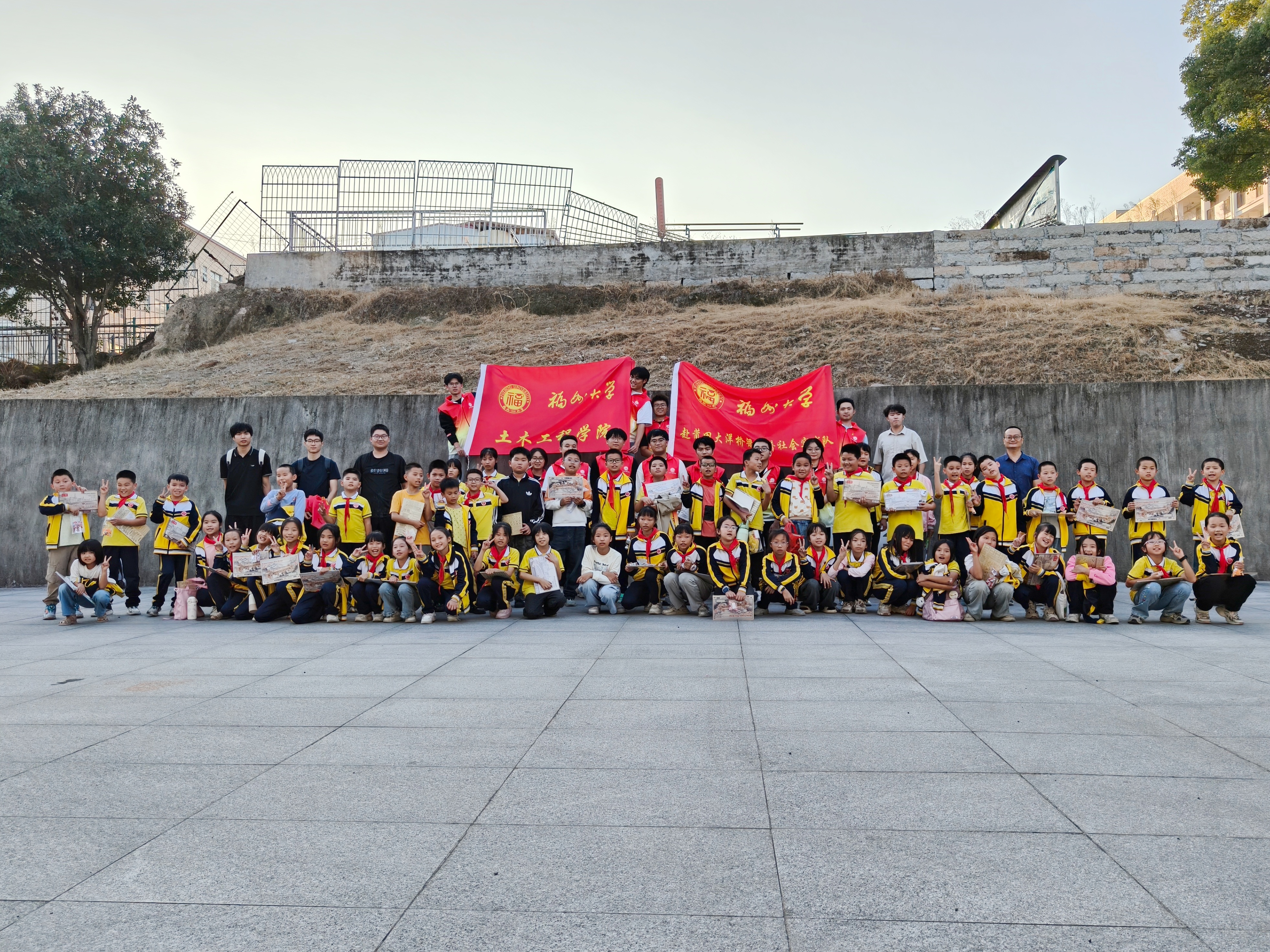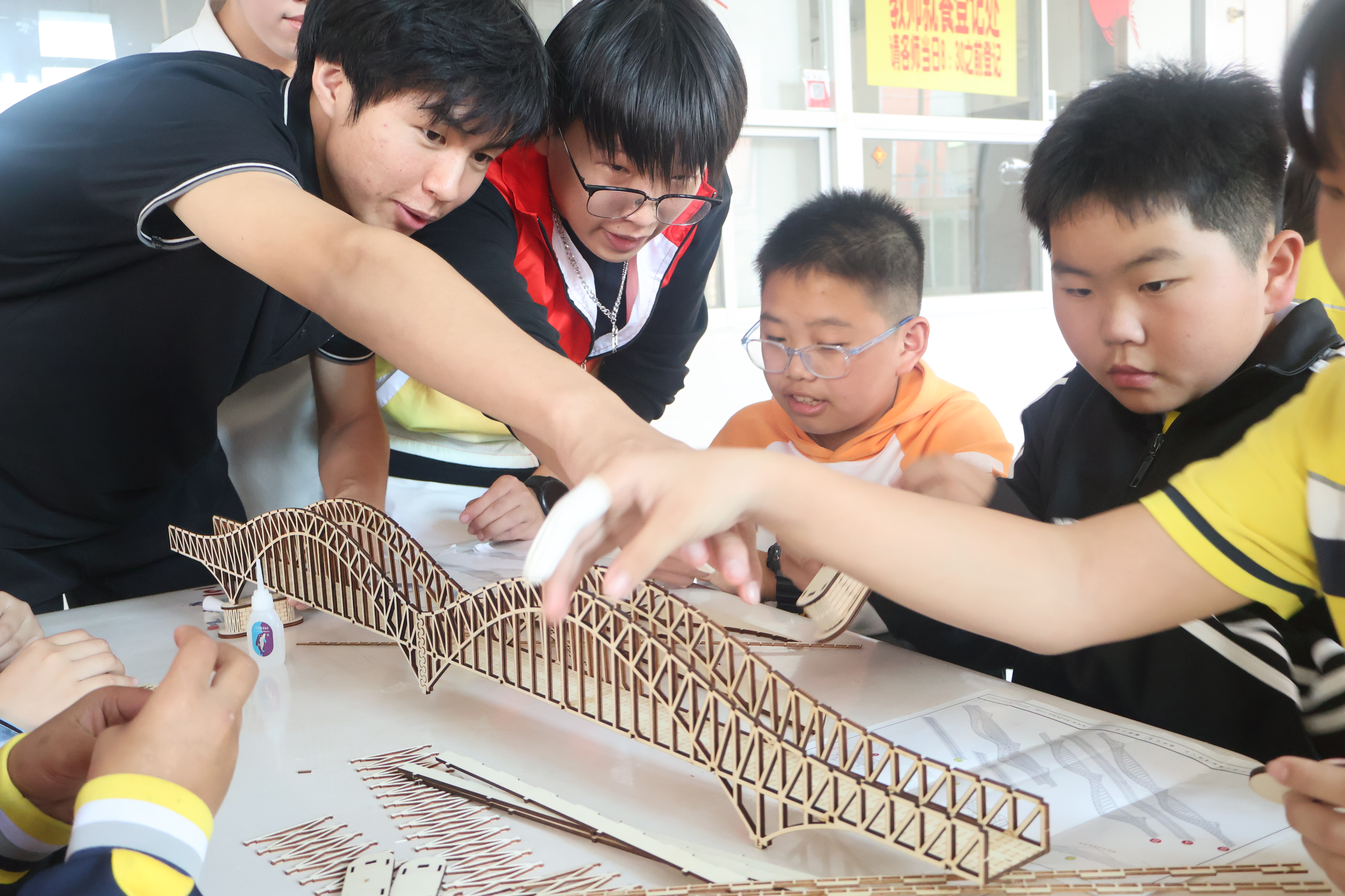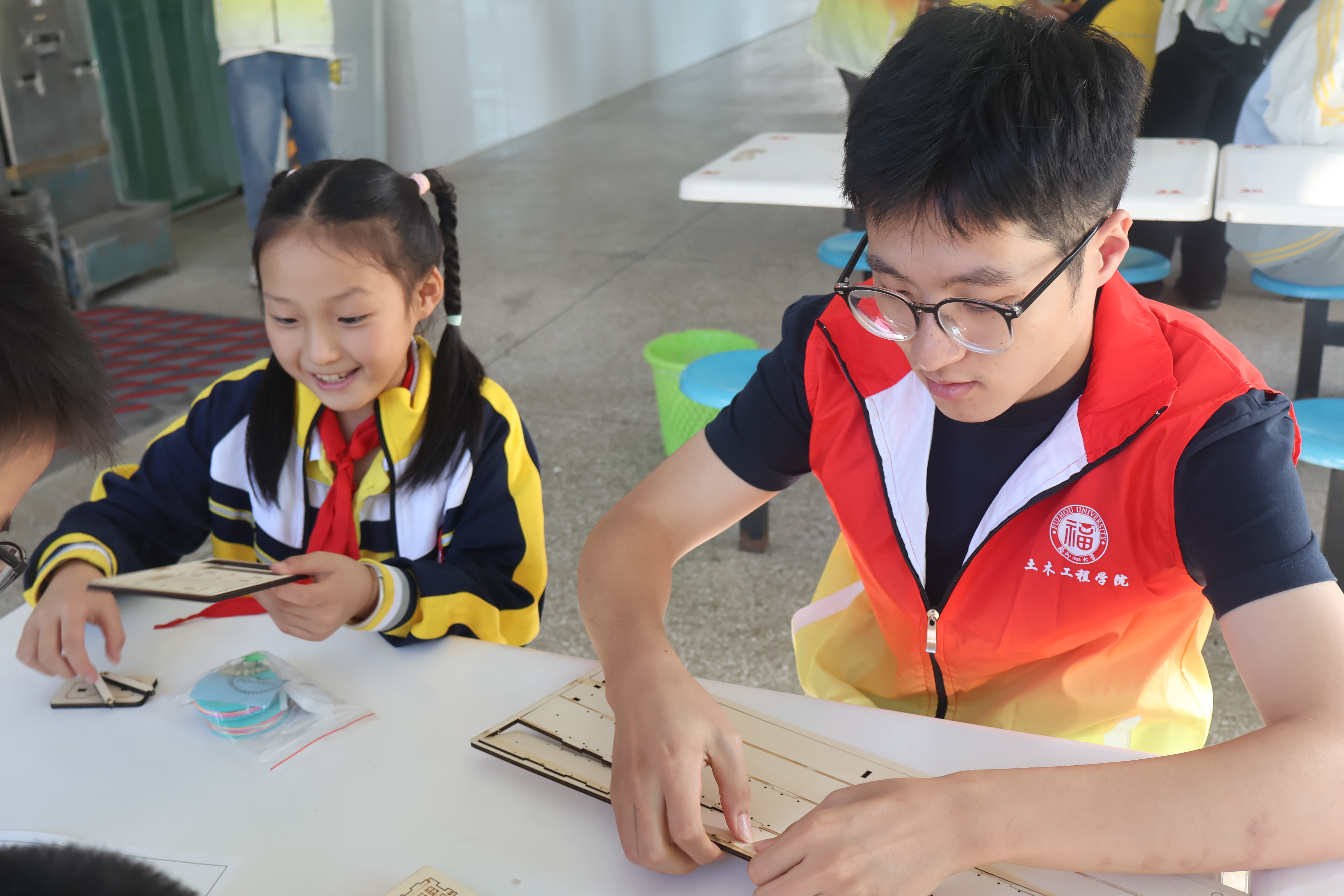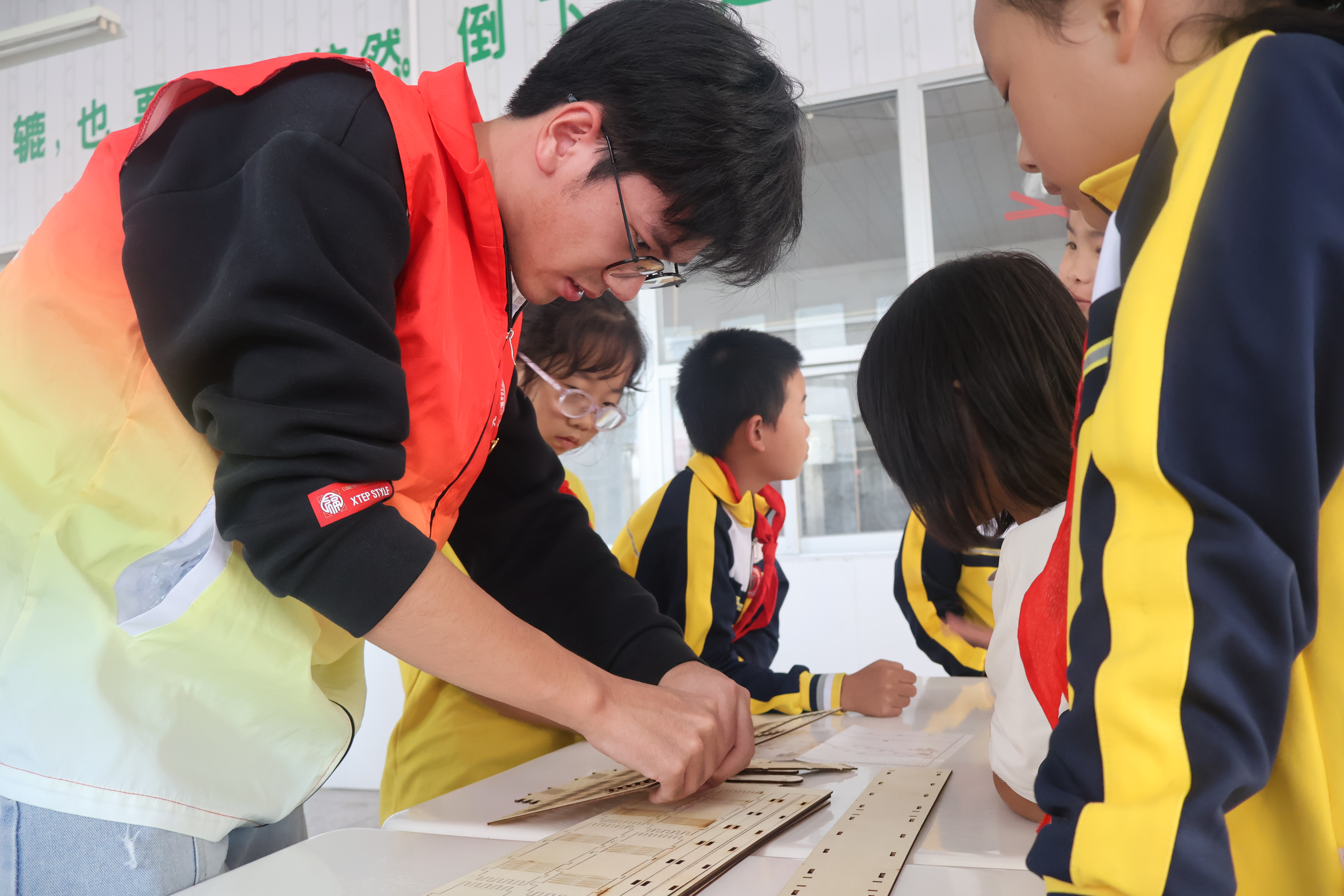 实践环节中,20余名学生分组带领60名小学生动手搭建桥梁模型。从结构设计到拼装协作,大朋友引导小朋友,共同完成了一座座精巧的实体模型。活动结束后,福大师生不仅将搭建好模型赠予每位参与学生,还专门赠送60名小学生一个桥梁模型,鼓励他们之后继续探索搭建,延续科学梦想。