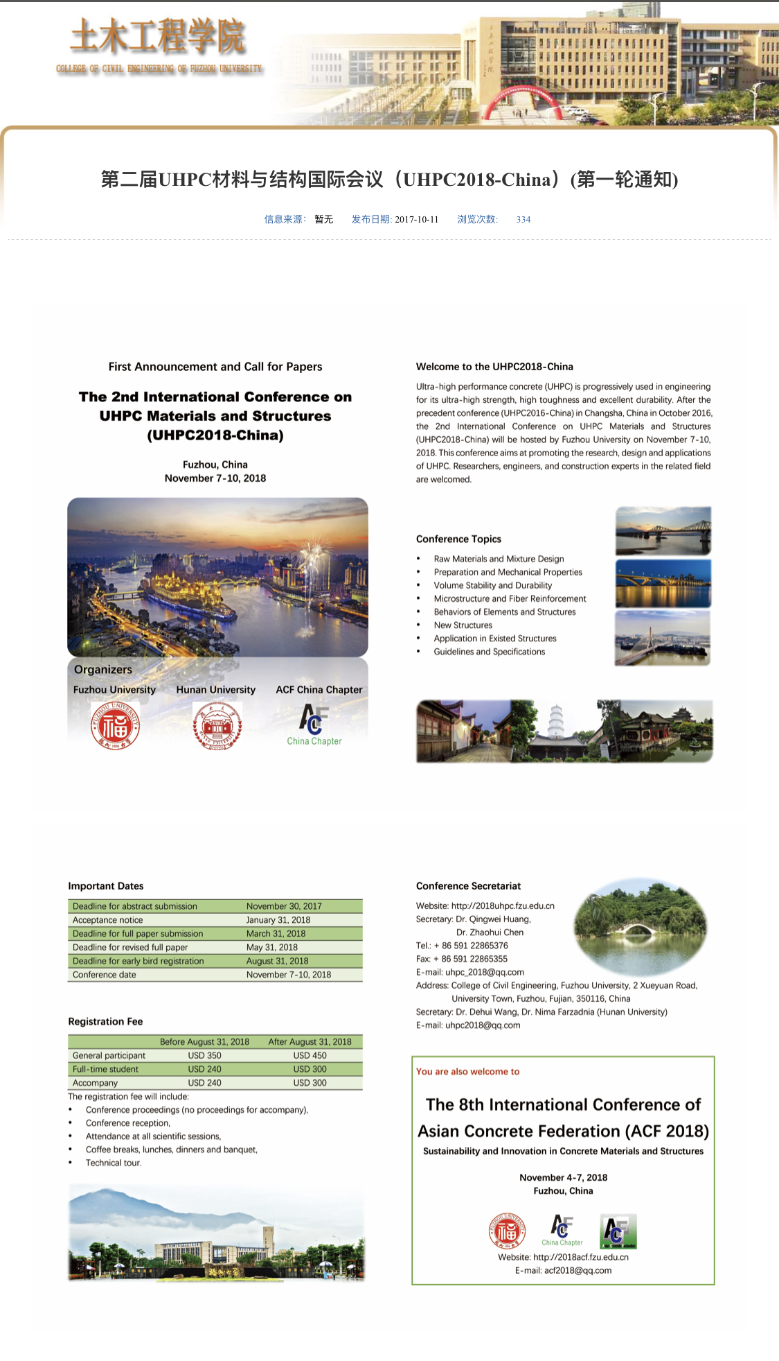 第二届超高性能混凝土材料和结构国际会议,定于2018年11月7-10日在福州举行,UHPC2018-China由绅士漫画 主办。会议将邀请国内外著名专家就超高性能混凝土材料和结构的研究、设计、工程应用以及发展趋势做专题报告,同时进行学术交流。
