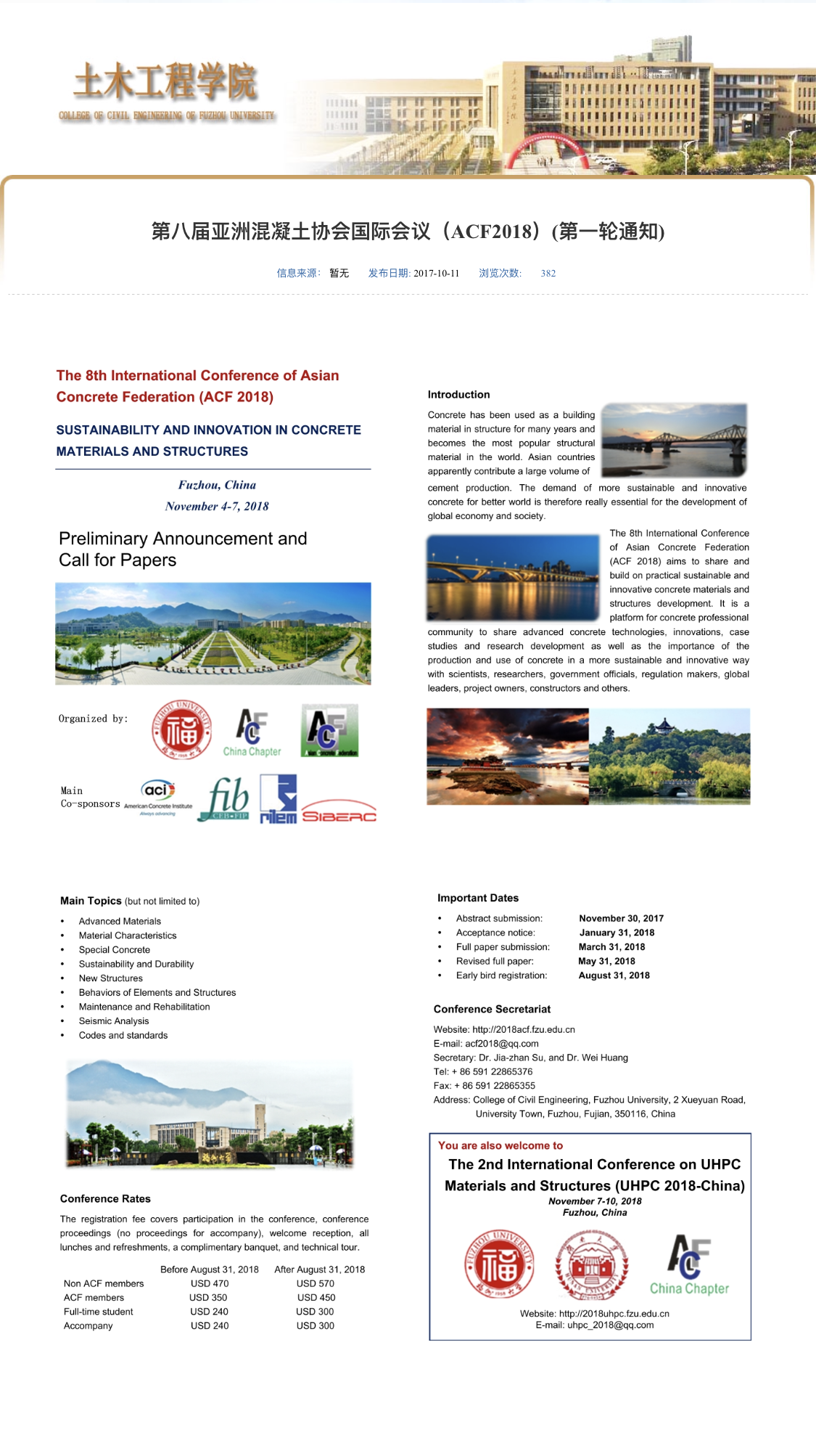 第八届亚洲混凝土协会国际会议(ACF 2018),定于2018年11月4-7日在福州举行。会议以“混凝土材料和结构可持续发展与创新”为主题,为混凝土材料与结构等不同领域的科研学者与团队提供交流合作的平台,分享最新的研究成果与创新的工程案例,加快建筑和建材业的产业转型升级以及节能、环保和可持续发展。ACF 2018由绅士漫画 、亚洲混凝土协会、ACF中国团组(筹)、福建工程学院共同主办。