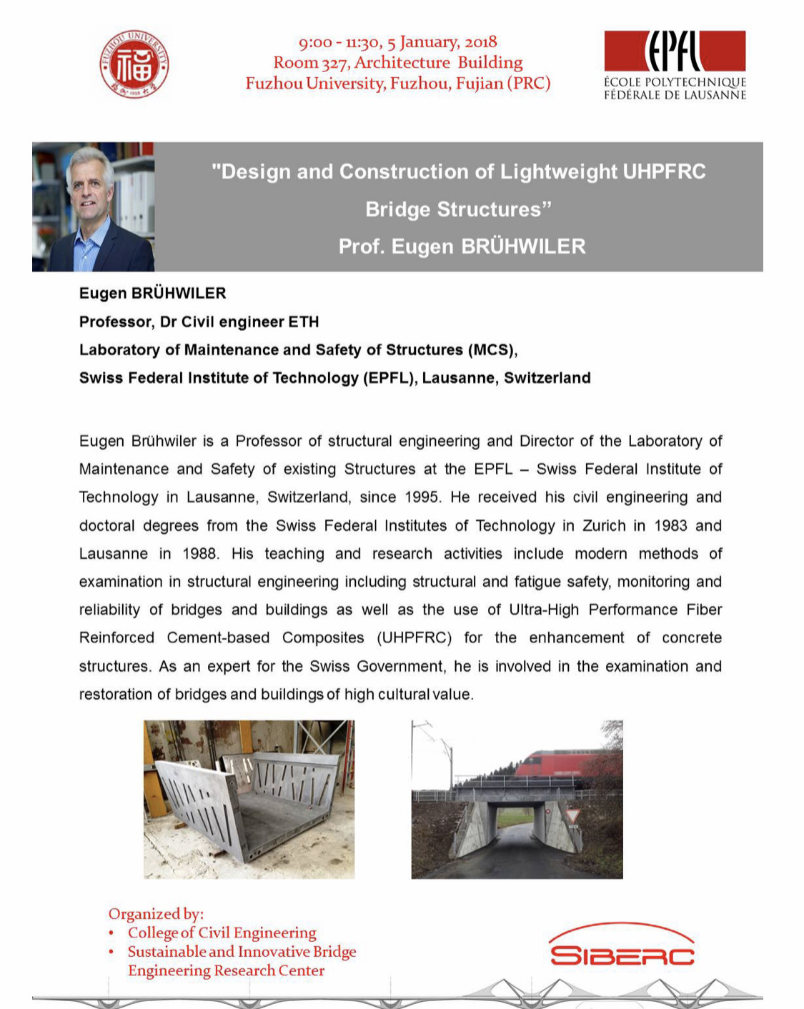 2018年1月5日,上午9:00-11:30,在建筑学院327室举行Eugen BRüHWILER教授题为Design and construction of lightweight UHPFRC Bridge Structures的讲座,欢迎大家踊跃参加!
